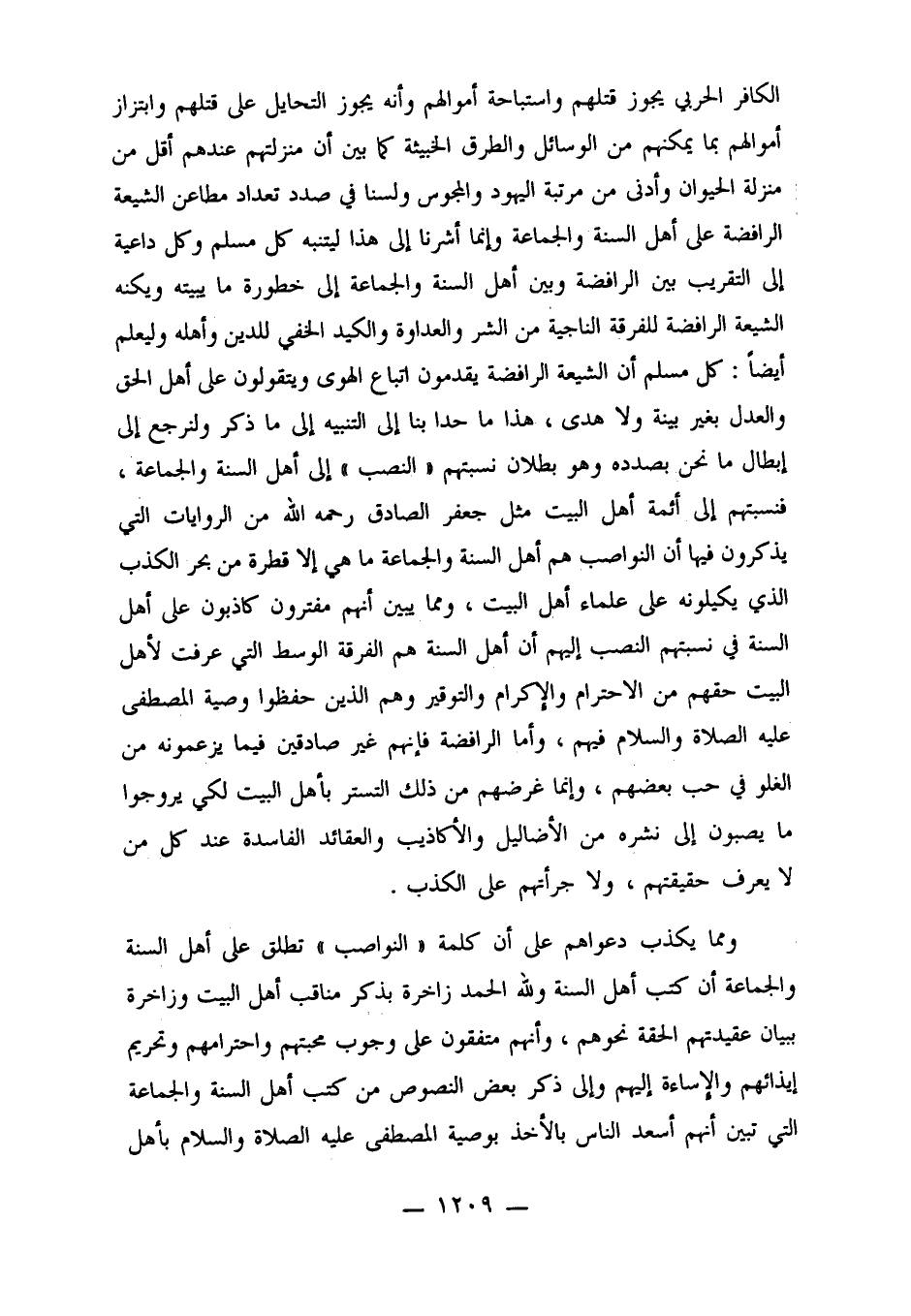 الكافر الحربي يجوز قتلهم واستباحة أموالهم وأنه يجوز التحايل على قتلهم وابتزاز أموالهم بما يمكنهم من الوسائل والطرق الخبيثة كما بين أن منزلتهم عندهم أقل من منزلة الحيوان وأدنى من مرتبة اليهود والمجوس ولسنا في صدد تعداد مطاعن الشيعة الرافضة على أهل السنة والجماعة وإنما أشرنا إلى هذا ليتنبه كل مسلم وكل داعية إلى التقريب بين الرافضة وبين أهل السنة والجماعة إلى خطورة ما يبيته ويكنه الشيعة الرافضة للفرقة الناجية من الشر والعداوة والكيد الخفي للدين وأهله وليعلم أيضاً: كل مسلم أن الشيعة الرافضة يقدمون اتباع الهوى ويتقولون على أهل الحق والعدل بغير بينة ولا هدى، هذا ما حدا بنا إلى التنبيه إلى ما ذكر ولنرجع إلى إبطال ما نحن بصدده وهو بطلان نسبتهم "النصب" إلى أهل السنة والجماعة، فنسبتهم إلى أئمة أهل البيت مثل جعفر الصادق رحمه الله من الروايات التي يذكرون فيها أن النواصب هم أهل السنة والجماعة ما هي إلا قطرة من بحر الكذب الذي يكيلونه على علماء أهل البيت، ومما يبين أنهم مفترون كاذبون على أهل السنة في نسبتهم النصب إليهم أن أهل السنة هم الفرقة الوسط التي عرفت لأهل البيت حقهم من الاحترام والإكرام والتوقير وهم الذين حفظوا وصية المصطفى عليه الصلاة والسلام فيهم، وأما الرافضة فإنهم غير صادقين فيما يزعمونه من الغلو في حب بعضهم، وإنما غرضهم من ذلك التستر بأهل البيت لكي يروجوا ما يصبون إلى نشره من الأضاليل والأكاذيب والعقائد الفاسدة عند كل من لا يعرف حقيقتهم، ولا جرأتهم على الكذب.