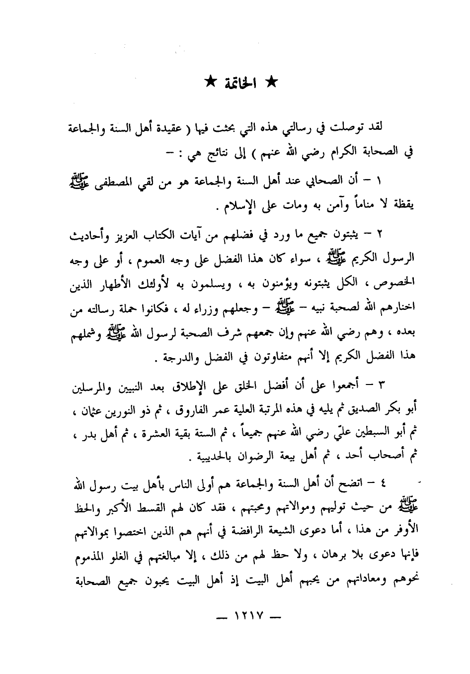 3. أجمعوا على أن أفضل الخلق على الإطلاق بعد النبيين والمرسلين أبو بكر الصديق ثم يليه في هذه المرتبة العلية عمر الفاروق، ثم ذو النورين عثمان، ثم أبو السبطين علي رضي الله عنهم جميعاً، ثم الستة بقية العشرة، ثم أهل بدر، ثم أصحاب أحد، ثم أهل بيعة الرضوان بالحديبية.