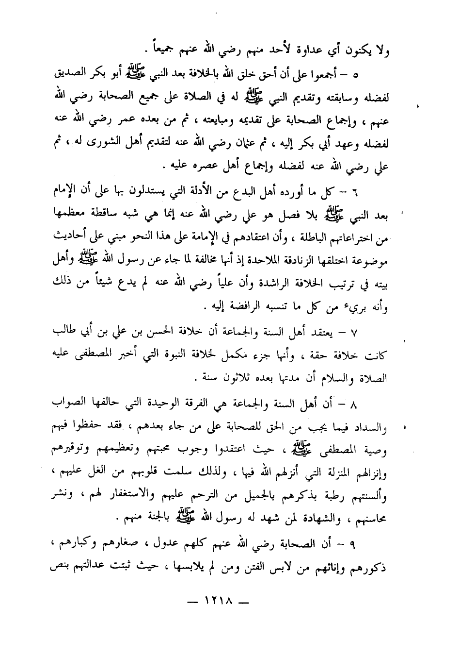5. أجمعوا على أن أحق خلق الله بالخلافة بعد النبي صلى الله عليه وسلم أبو بكر الصديق لفضله وسابقته وتقديم النبي صلى الله عليه وسلم له في الصلاة على جميع الصحابة رضي الله عنهم، وإجماع الصحابة على تقديمه ومبايعته، ثم من بعده عمر رضي الله عنه لفضله وعهد أبي بكر إليه، ثم عثمان رضي الله عنه لتقديم أهل الشورى له، ثم علي رضي الله عنه لفضله وإجماع أهل عصره عليه.