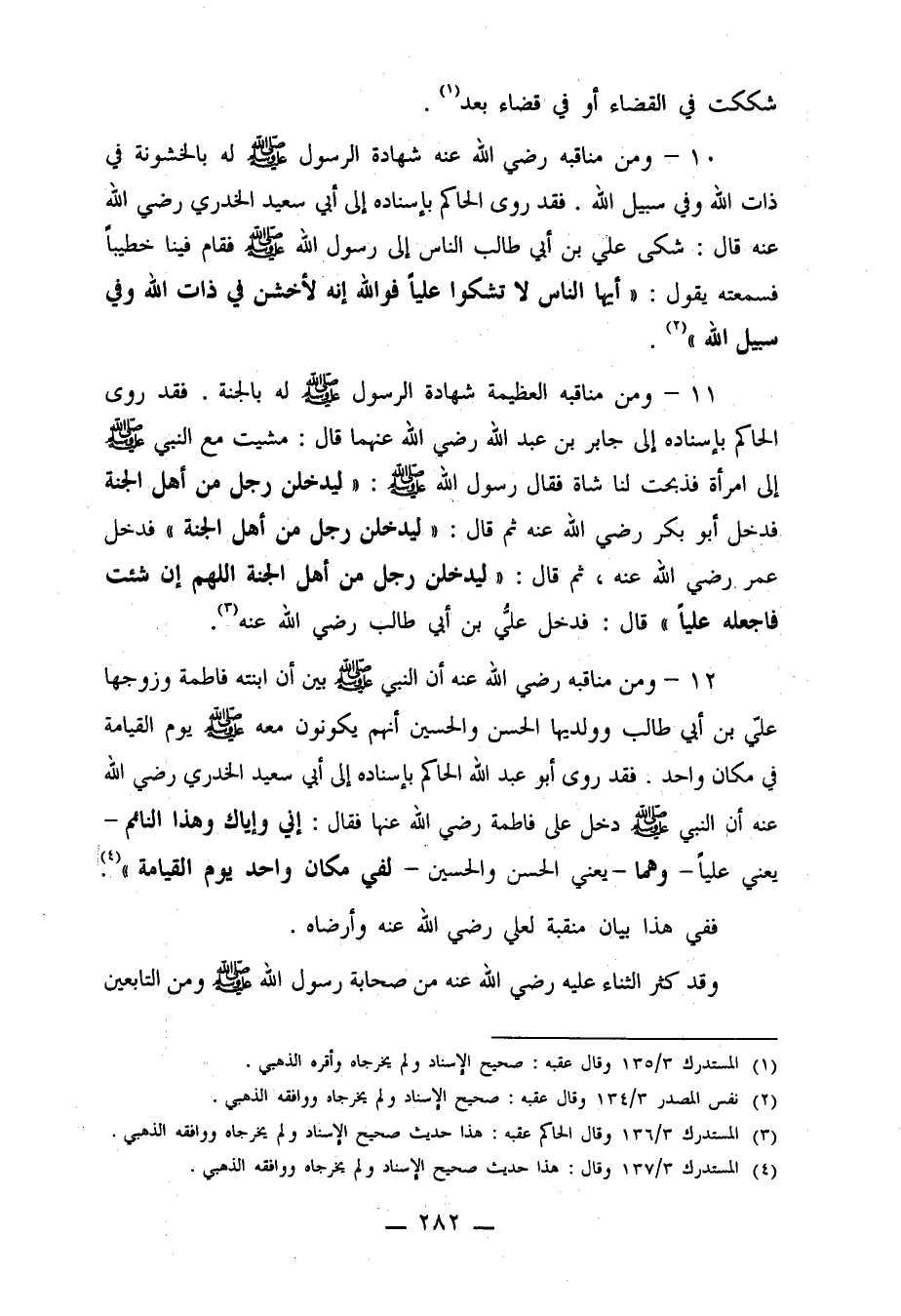 11- ومن مناقبه العظيمة شهادة الرسول صلى الله عليه وسلم له بالجنة. فقد روى الحاكم بإسناده إلى جابر بن عبد الله رضي الله عنهما قال: مشيت مع النبي صلى الله عليه وسلم إلى امرأة فذبحت لنا شاة فقال رسول الله صلى الله عليه وسلم: "ليدخلن رجل من أهل الجنة فدخل أبو بكر رضي الله عنه ثم قال: "ليدخلن رجل من أهل الجنة فدخل أبو بكر رضي الله عنه ثم قال: "ليدخلن رجل من أهل الجنة" فدخل عمر رضي الله عنه، ثم قال: "ليدخلن رجل من أهل الجنة اللهم إن شئت فاجعله علياً" قال: فدخل علي بن أبي طالب رضي الله عنه3.