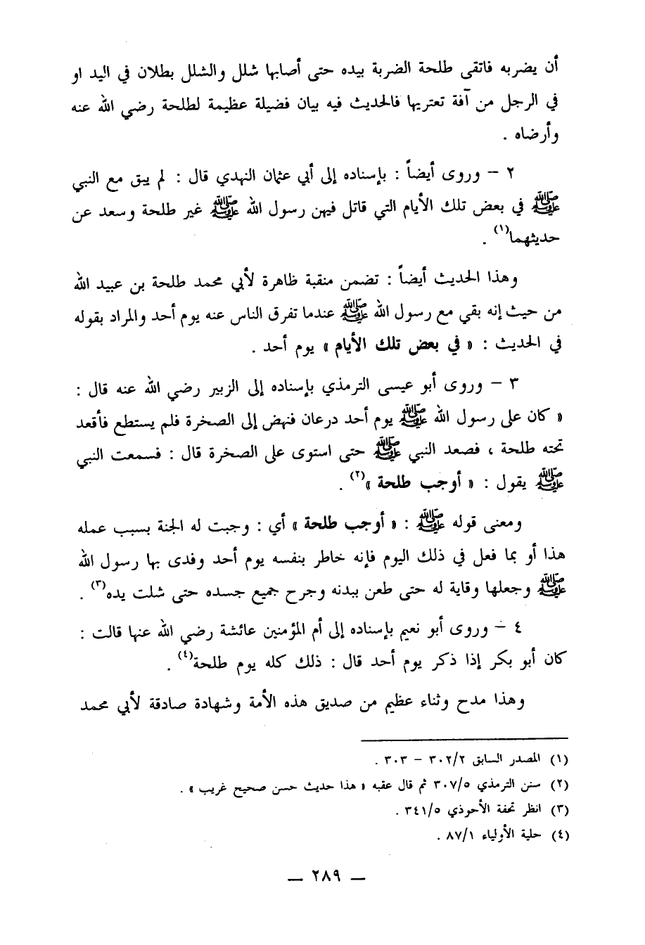 3- وروى أبو عيسى الترمذي بإسناده إلى الزبير رضي الله عنه قال: "كان على رسول الله صلى الله عليه وسلم يوم أحد درعان فنهض إلى الصخرة فلم يستطع فأقعد تحته طلحة، فصعد النبي صلى الله عليه وسلم حتى استوى على الصخرة قال: فسمعت النبي صلى الله عليه وسلم يقول: "أوجب طلحة" 2.