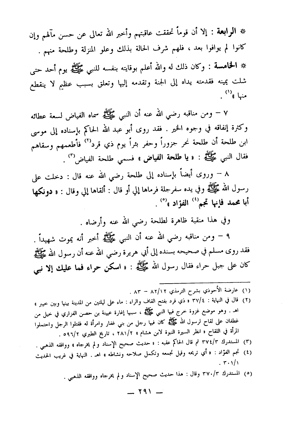 7- ومن مناقبه رضي الله عنه أن النبي صلى الله عليه وسلم سماه الفياض لسعة عطائه وكثرة إنفاقه في وجوه الخير. فقد روى أبو عبد الله الحاكم بإسناده إلى موسى بن طلحة أن طلحة نحر جزوراً وحفر بئراً يوم ذي قرد2 فأطعمهم وسقاهم فقال النبي صلى الله عليه وسلم: "يا طلحة الفياض" فسمي طلحة الفياض3.