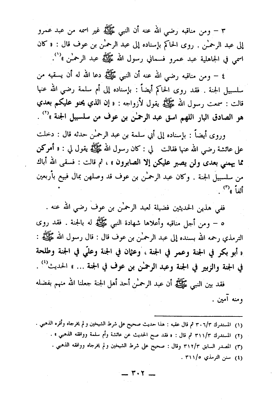 4- ومن مناقبه رضي الله عنه أن النبي صلى الله عليه وسلم دعا الله له أن يسقيه من سلسبيل الجنة. فقد روى الحاكم أيضاً بإسناده إلى أم سلمة رضي الله عنها قالت: سمعت رسول الله صلى الله عليه وسلم يقول لأزواجه: "إن الذي يحنو عليكم بعدي هو الصادق البار اللهم اسق عبد الرحمن بن عوف من سلسبيل الجنة" 2.