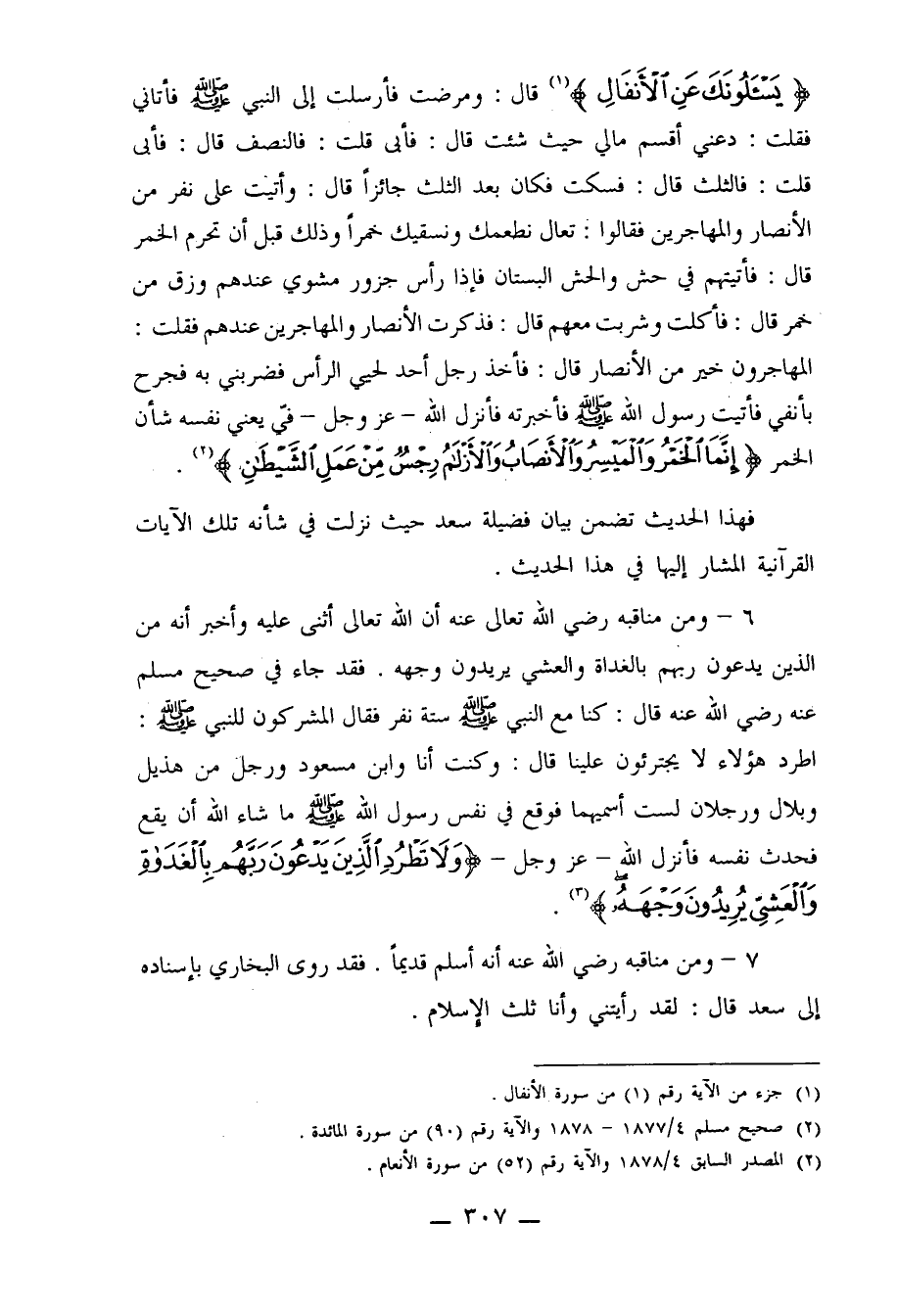 {يَسْأَلونَكَ عَنِ الْأَنْفَالِ} 1 قال: ومرضت فأرسلت إلى النبي صلى الله عليه وسلم فأتاني فقلت: دعني أقسم مالي حيث شئت قال: فأبى قلت: فالنصف قال: فأبى قلت: فالثلث قال: فسكت فكان بعد الثلث جائزاً قال: وأتيت على نفر من الأنصار والمهاجرين فقالوا: تعالى نطعمك ونسقيك خمراً وذلك قبل أن تحرم الخمر قال: فأتيتهم في حش والحش البستان فإذا رأس جزور مشوي عندهم وزق من خمر قال: فأكلت وشربت معهم قال: فذكرت الأنصار والمهاجرين عندهم فقلت: المهاجرون خير من الأنصار قال: فأخذ رجل أحد لحيي الرأس فضربني به فجرح بأنفي فأتيت رسول الله صلى الله عليه وسلم فأخبرته فأنزل الله ـ عز وجل ـ فيّ يعني نفسه شأن الخمر {إِنَّمَا الْخَمْرُ وَالْمَيْسِرُ وَالْأَنْصَابُ وَالْأَزْلامُ رِجْسٌ مِنْ عَمَلِ الشَّيْطَانِ} 2.