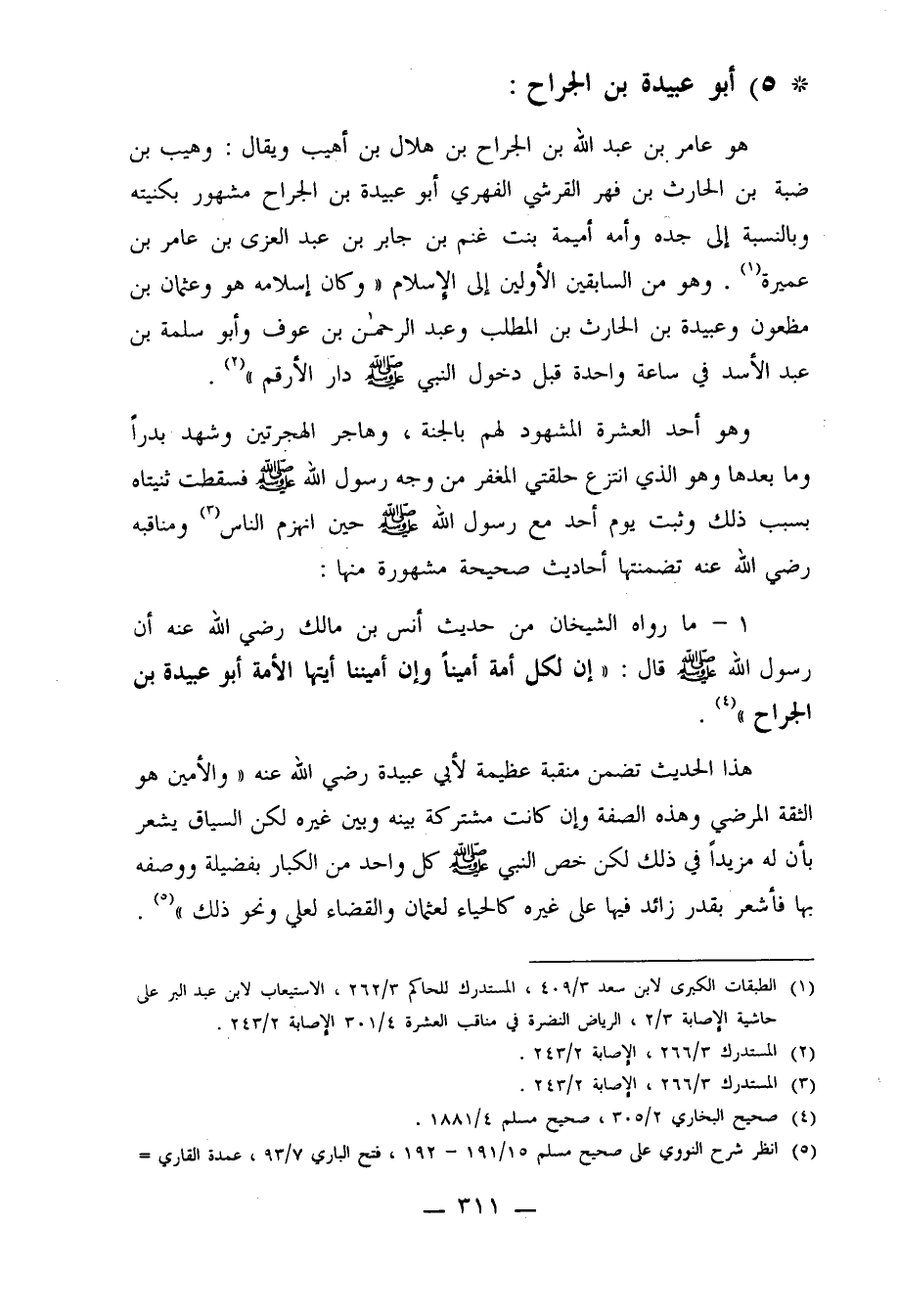 1- ما رواه الشيخان من حديث أنس بن مالك رضي الله عنه أن رسول الله صلى الله عليه وسلم قال: "إن لكل أمة أميناً وإن أميننا أيتها الأمة أبو عبيدة بن الجراح" 4.