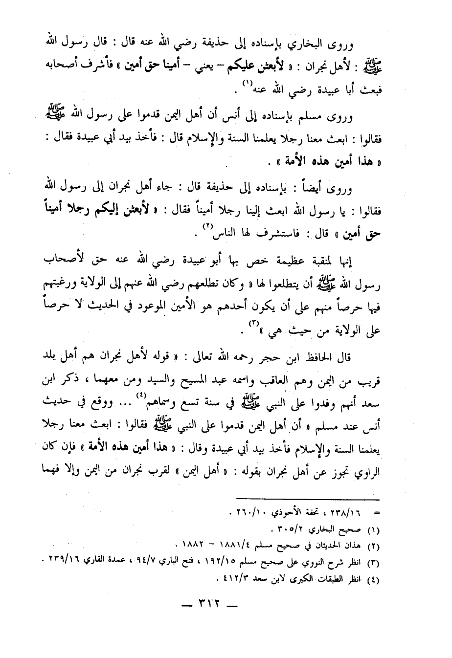 وروى البخاري بإسناده إلى حذيفة رضي الله عنه قال: قال رسول الله صلى الله عليه وسلم: لأهل نجران: "لأبعثن عليكم ـ يعني ـ أميناً حق أمين" فأشرف أصحابه فبعث أبا عبيدة رضي الله عنه1.
