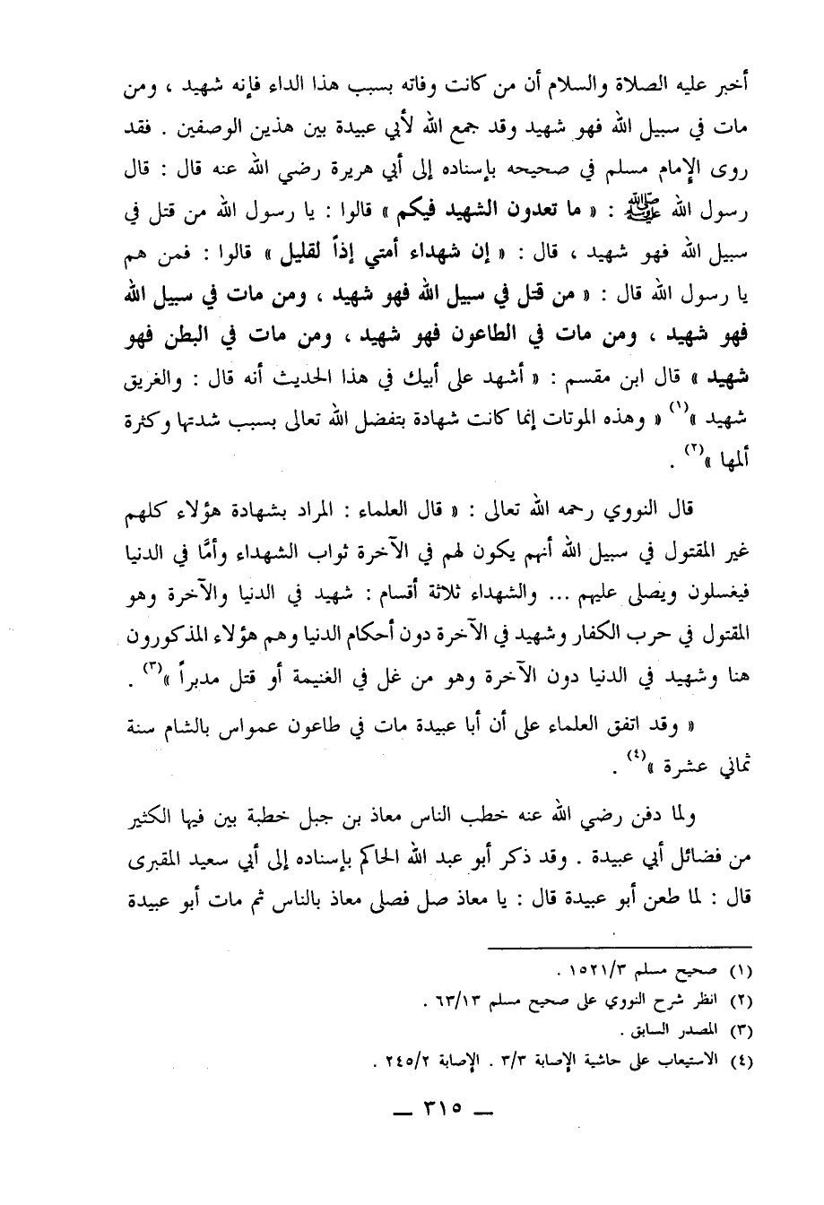 أخبر عليه الصلاة والسلام أن من كانت وفاته بسبب هذا الداء فإنه شهيد، ومن مات في سبيل الله فهو شهيد وقد جمع الله لأبي عبيدة بين هذين الوصفين. فقد روى الإمام مسلم في صحيحه بإسناده إلى أبي هريرة رضي الله عنه قال: قال رسول الله صلى الله عليه وسلم: " ما تعدون الشهيد فيكم" قالوا: يا رسول الله من قتل في سبيل الله فهو شهيد، قال: "إن شهداء أمتي إذا لقليل" قالوا: فمن هم يا رسول الله قال: "من قتل في سبيل الله فهو شهيد، ومن مات في سبيل الله فهو شهيد، ومن مات في الطاعون فهو شهيد، ومن مات في البطن فهو شهيد" قال ابن مقسم: "أشهد على أبيك في هذا الحديث أنه قال: والغريق شهيد "1 "وهذه الموتات إنما كانت شهادة بتفضيل الله تعالى بسبب شهدتها وكثرة ألمها"2.
