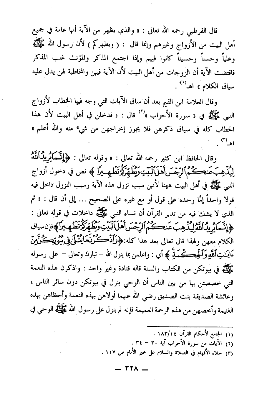 وقال العلامة ابن القيم بعد أن ساق الآيات التي وجه فيها الخطاب لأزواج النبي صلى الله عليه وسلم في "سورة الأحزاب"2 قال: "فدخلن في أهل البيت لأن هذا الخطاب كله في سياق ذكرهن فلا يجوز إخراجهن من شيء منه والله أعلم"أ. هـ3.
