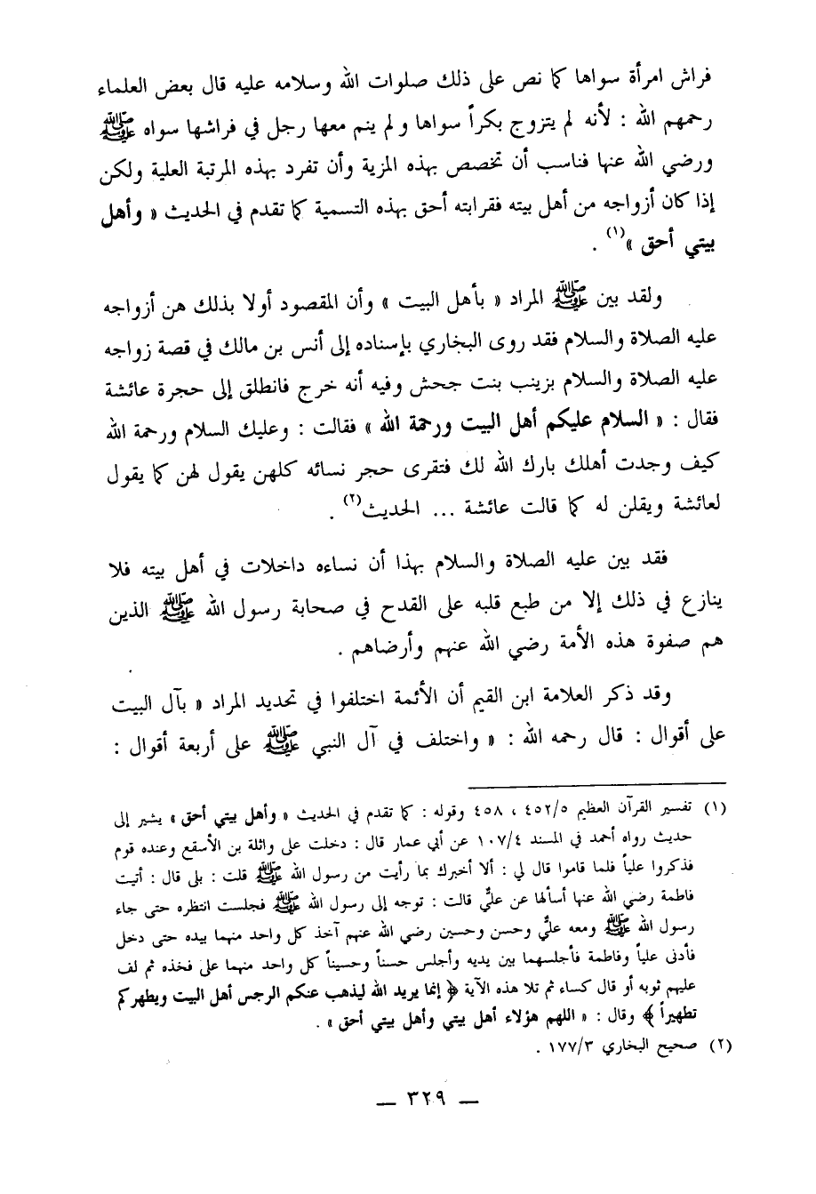 1ـ تفسير القرآن العظيم 5/452، 458 وقوله: "كما تقدم في الحديث "وأهل بيتي أحق" يشير إلى حديث رواه أحمد في المسند 4/107 عن أبي عمار قال: دخلت على واثلة بن الأسقع وعنده قوم فذكروا علياً فلما قاموا قال لي: ألا أخبرك بما رأيت من رسول الله صلى الله عليه وسلم قلت: بلى، قال: أتيت فاطمة رضي الله عنها أسألها عن علي قالت: توجه إلى رسول الله صلى الله عليه وسلم فجلست أنتظره حتى جاء رسول الله صلى الله عليه وسلم ومعه علي وحسن وحسين رضي الله عنهم أخذ كل واحد منهما بيده حتى دخلا فأدنا علياً وفاطمة فأجلسهما بين يديه وأجلس حسناً وحسيناً كل واحد منهما على فخذه ثم لف عليهم ثوبه أو قال كساء ثم تلا هذه الآية {إِنَّمَا يُرِيدُ اللَّهُ لِيُذْهِبَ عَنْكُمُ الرِّجْسَ أَهْلَ الْبَيْتِ وَيُطَهِّرَكُمْ تَطْهِيراً} وقال: " اللهم هؤلاء أهل بيتي وأهل بيتي أحق".