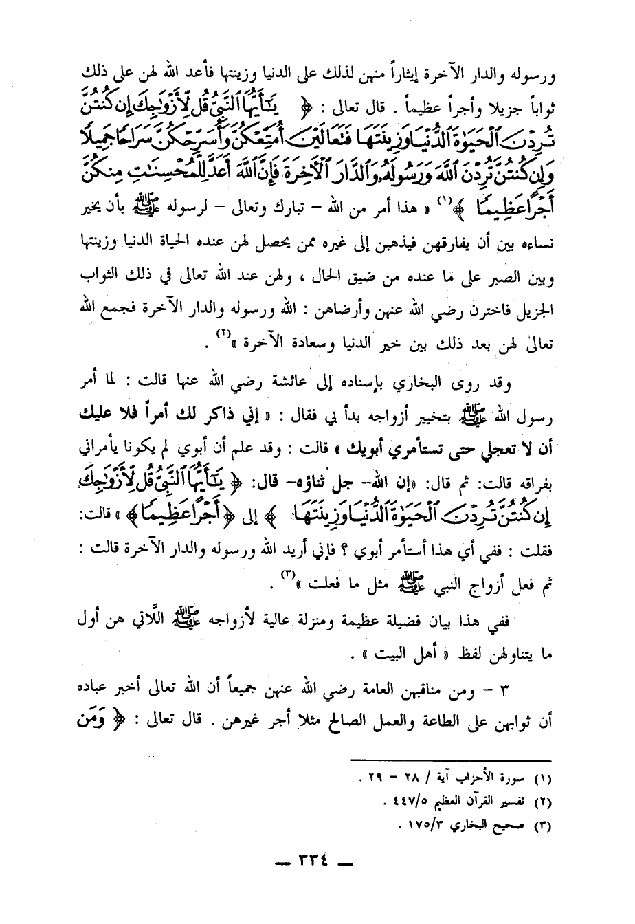 ورسوله والدار الآخرة إيثاراً منهن لذلك على الدنيا وزينتها فأعد الله لهن على ذلك ثواباً جزيلاً وأجراً عظيماً قال تعالى: {يَا أَيُّهَا النَّبِيُّ قُلْ لأَزْوَاجِكَ إِنْ كُنْتُنَّ تُرِدْنَ الْحَيَاةَ الدُّنْيَا وَزِينَتَهَا فَتَعَالَيْنَ أُمَتِّعْكُنَّ وَأُسَرِّحْكُنَّ سَرَاحاً جَمِيلاً * وَإِنْ كُنْتُنَّ تُرِدْنَ اللَّهَ وَرَسُولَهُ وَالدَّارَ الآخِرَةَ فَإِنَّ اللَّهَ أَعَدَّ لِلْمُحْسِنَاتِ مِنْكُنَّ أَجْراً عَظِيماً} 1. "هذا أمر من الله ـ تبارك وتعالى ـ لرسوله صلى الله عليه وسلم بأن يخير نساءه بين أن يفارقهن فيذهبن إلى غيره ممن يحصل لهن عنده الحياة الدنيا وزينتها وبين الصبر على ما عنده من ضيق الحال، ولهن عند الله تعالى في ذلك الثواب الجزيل فاخترن رضي الله عنهن وأرضاهن: الله ورسوله والدار الآخرة فجمع الله تعالى لهن بعد ذلك بين خير الدنيا وسعادة الآخرة"2.