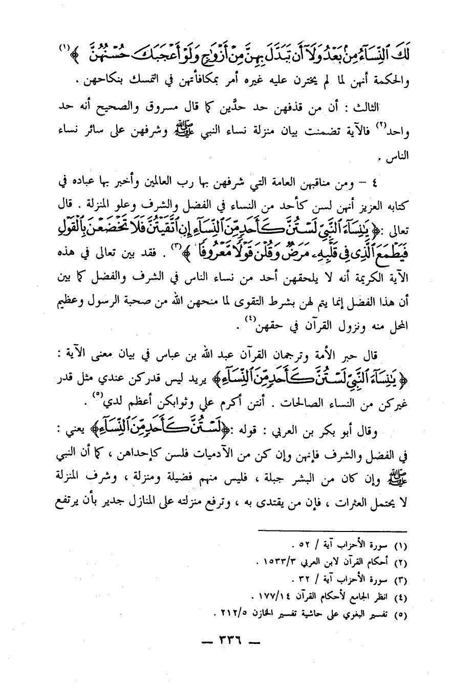 قال حبر الأمة وترجمان القرآن عبد الله بن عباس في بيان معنى الآية: {يَا نِسَاءَ النَّبِيِّ لَسْتُنَّ كَأَحَدٍ مِنَ النِّسَاءِ} يريد ليس قدركن عندي مثل قدر غيركن من النساء الصالحات. أنتن أكرم علي وثوابكن أعظم لدي5.