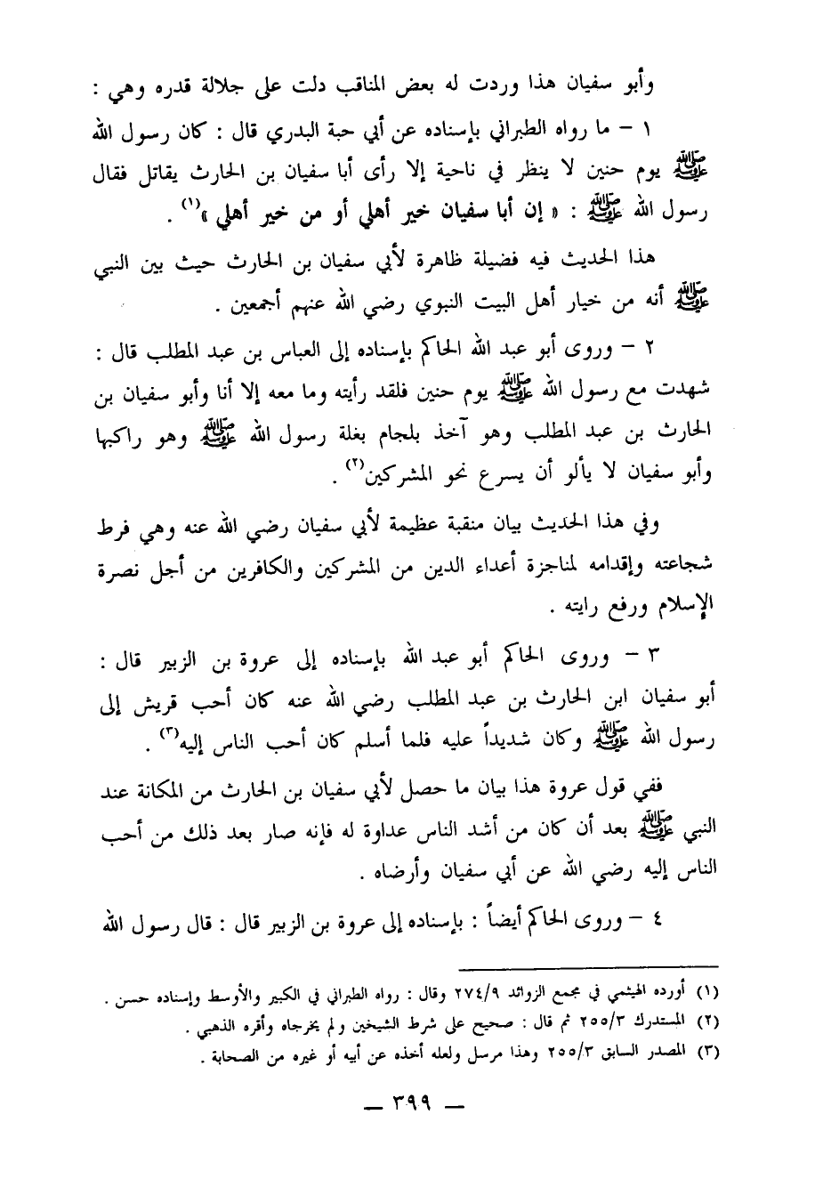 2- وروى أبو عبد الله الحاكم بإسناده إلى العباس بن عبد المطلب قال: شهدت مع رسول الله صلى الله عليه وسلم يوم حنين فلقد رأيته وما معه إلا أنا وأبو سفيان بن الحارث بن عبد المطلب وهو آخذ بلجام بغلة رسول الله صلى الله عليه وسلم وهو راكبها وأبو سفيان لا يألوا أن يسرع نحو المشركين2.