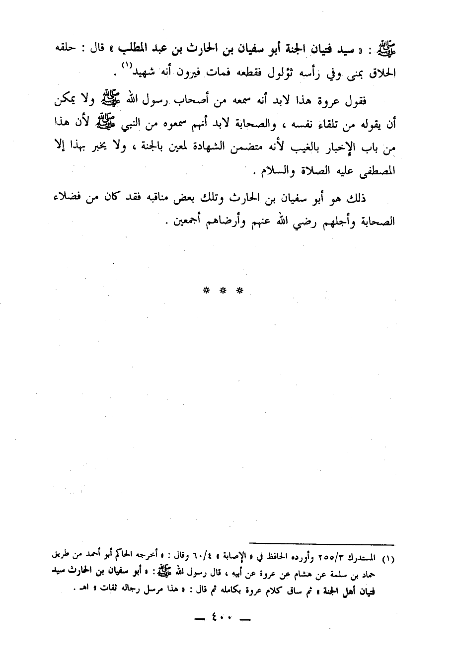 1ـ المستدرك 3/255 وأورده الحافظ في "الإصابة" 4/60 وقال: "أخرجه الحاكم أبو أحمد من طريق حماد بن سلمة عن هشام عن عروة عن أبيه، قال قال رسول الله صلى الله عليه وسلم: "أبو سفيان بن الحارث سيد فتيان أهل الجنة" ثم ساق كلام عروة بكامله ثم قال: "هذا مرسل رجاله ثقات"أهـ.