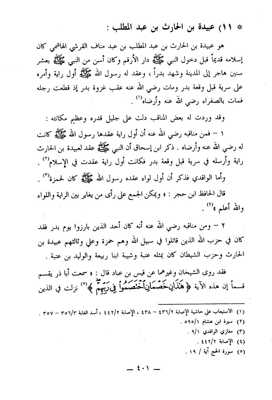 هو عبيدة بن الحارث بن عبد المطلب بن عبد مناف القرشي الهاشمي كان إسلامه قديماً قبل دخول النبي صلى الله عليه وسلم دار الأرقم وكان أسن من النبي صلى الله عليه وسلم بعشر سنين هاجر إلى المدينة وشهد بدراً، وعقد له رسول الله صلى الله عليه وسلم أول راية وأمره على سرية قبل وقعة بدر ومات رضي الله عنه عقب غزوة بدر إذ قطعت رجله فمات بالصفراء رضي الله عنه وأرضاه1.