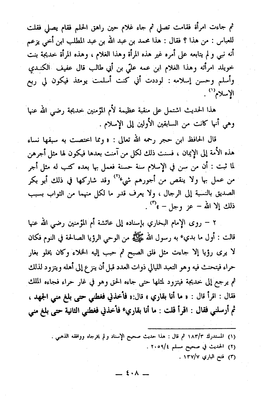 ثم جاءت امرأة فقامت تصلي ثم جاء غلام حين راهق الحلم فقام يصلي فقلت للعباس: من هذا؟ فقال: هذا محمد بن عبد الله بن عبد المطلب بن أخي يزعم أنه نبي ولم يتابعه على أمره غير هذه المرأة وهذا الغلام، وهذه المرأة خديجة بنت خويلد امرأته وهذا الغلام ابن عمه علي بن أبي طالب قال عفيف الكندي: وأسلم وحسن إسلامه: لوددت أني كنت أسلمت يومئذ فيكون لي ربع الإسلام1.