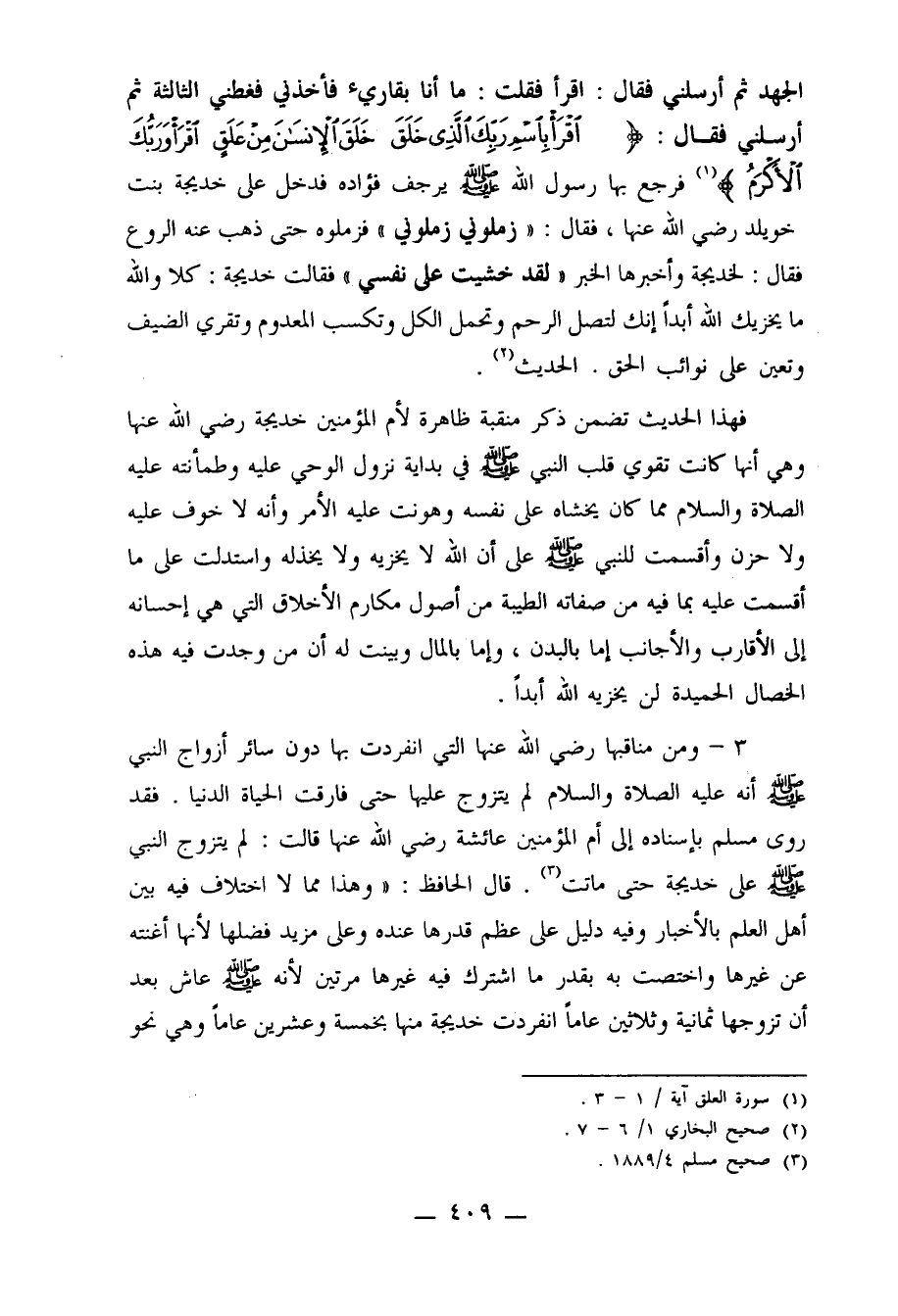 الجهد ثم أرسلني فقال: اقرأ فقلت: ما أنا بقارئ فأخذني فغطني الثالثة ثم أرسلني فقال: {اقْرَأْ بِاسْمِ رَبِّكَ الَّذِي خَلَقَ * خَلَقَ الأِنْسَانَ مِنْ عَلَقٍ * اقْرَأْ وَرَبُّكَ الأَكْرَمُ} 1 فرجع بها رسول الله صلى الله عليه وسلم يرجف فؤاده فدخل على خديجة بنت خويلد رضي الله عنها، فقال: " زملوني زملوني" فزملوه حتى ذهب عنه الروع فقال: لخديجة وأخبرها الخبر "لقد خشيت على نفسي" فقالت خديجة: كلا والله ما يخزيك الله أبداً إنك لتصل الرحم وتحمل الكل وتكسب المعدوم وتقري الضيف وتعين على نوائب الحق. الحديث2.