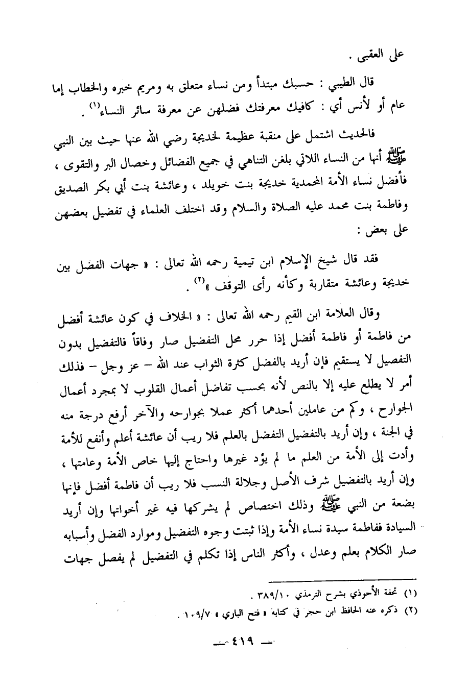 فقد قال شيخ الإسلام ابن تيمية رحمه الله تعالى: "جهات الفضل بين خديجة وعائشة متقاربة وكأنه رأى التوقف"2.
