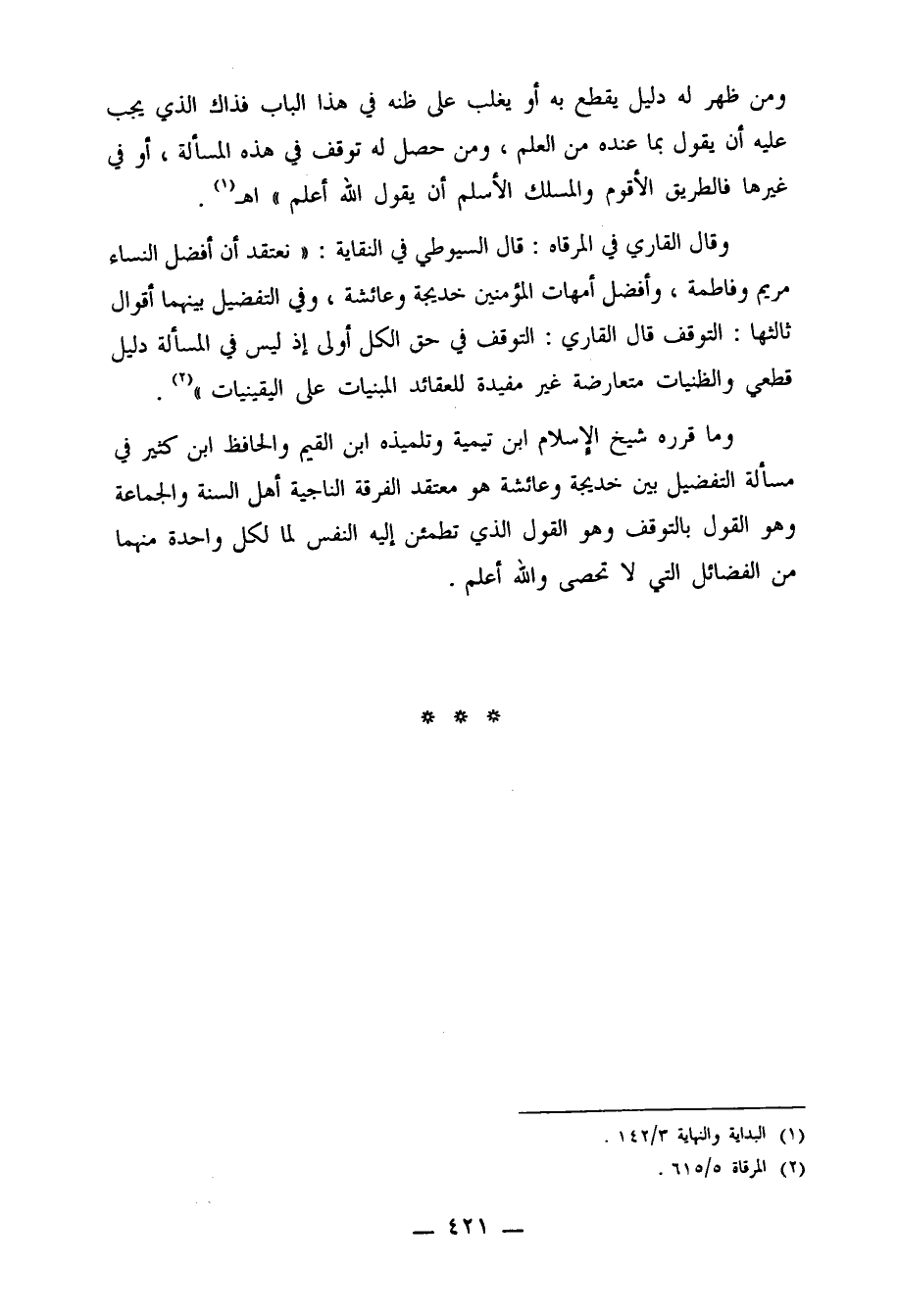 وقال القاري في المرقاة: قال السيوطي في النقاية: "نعتقد أن أفضل النساء مريم وفاطمة، وأفضل أمهات المؤمنين خديجة وعائشة، وفي التفضيل بينهما أقوال ثالثها: التوقف قال القاري: التوقف في حق الكل أولى إذ ليس في المسألة دليل قطعي والظنيات متعارضة غير مفيدة للعقائد المبنيات على اليقينيات"2.
