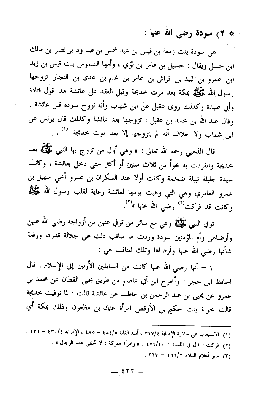 قال الذهبي رحمه الله تعالى: "وهي أول من تزوج بها النبي صلى الله عليه وسلم بعد خديجة وانفردت به نحواً من ثلاث سنين أو أكثر حتى دخل بعائشة وكانت سيدة جليلة نبيلة ضخمة وكانت أولاً عند السكران بن عمرو أخي سهيل بن عمرو العامري وهي التي وهبت يومها لعائشة رعاية لقلب رسول الله صلى الله عليه وسلم وكانت قد فركت2 رضي الله عنها"3.