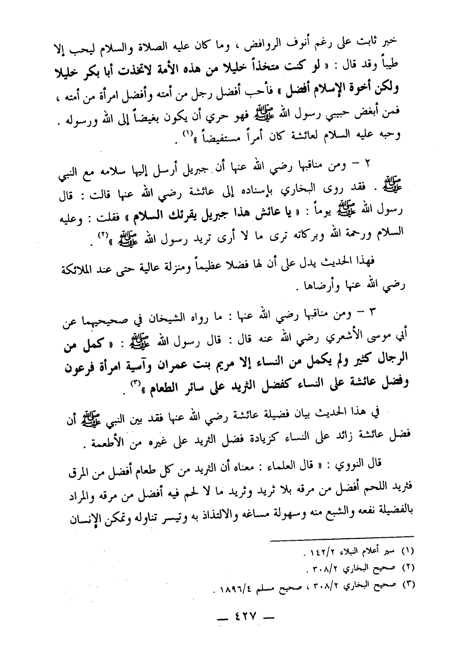 3- ومن مناقبها رضي الله عنها: ما رواه الشيخان في صحيحيهما عن أبي موسى الأشعري رضي الله عنه قال: قال رسول الله صلى الله عليه وسلم: " كمل من الرجال كثير ولم يكمل من النساء إلا مريم بنت عمران وآسية امرأة فرعون وفضل عائشة على النساء كفضل الثريد على سائر الطعام" 3.