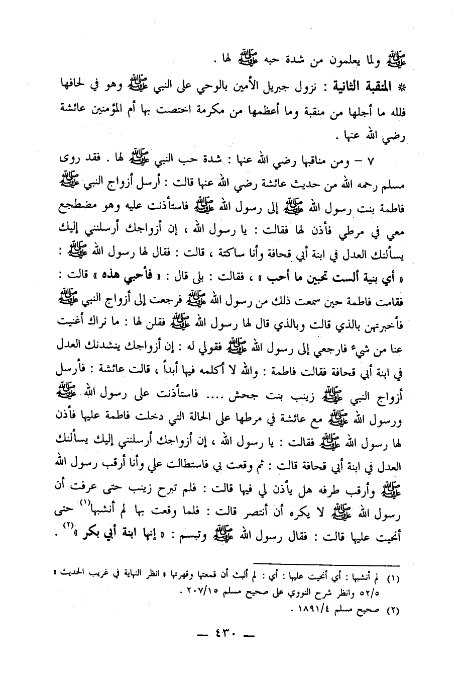 7- ومن مناقبها رضي الله عنها: شدة حب النبي صلى الله عليه وسلم لها. فقد روى مسلم من حديث عائشة رضي الله عنها قالت: أرسل أزواج النبي صلى الله عليه وسلم فاطمة بنت رسول الله صلى الله عليه وسلم إلى رسول الله صلى الله عليه وسلم فاستأذنت عليه وهو مضطجع معي في مرطي فأذن لها فقالت: يا رسول الله، إن أزواجك أرسلنني إليك يسألنك العدل في ابنة أبي قحافة وأنا ساكتة، قالت: فقال لها رسول الله صلى الله عليه وسلم: " أي بنية ألست تحبين ما أحب"، فقالت: بلى قال: "فأحبي هذه" قالت: فقامت فاطمة حين سمعت ذلك من رسول الله صلى الله عليه وسلم فرجعت إلى أزواج النبي فأخبرتهن بالذي قالت وبالذي قال لها رسول الله صلى الله عليه وسلم وقلنا لها: ما نراك أغنيت عنا في شيء فارجعي إلى رسول الله صلى الله عليه وسلم فقولي له: إن أزواجك ينشدنك العدل في ابنة أبي قحابة فقالت فاطمة: والله لا أكلمه فيها أبداً، قالت عائشة: فأرسل أزواج النبي صلى الله عليه وسلم زينب بنت جحش ... فاستأذنت على رسول الله صلى الله عليه وسلم ورسول الله صلى الله عليه وسلم مع عائشة في مرطها على الحالة التي دخلت فاطمة عليها فأذن لها رسول الله صلى الله عليه وسلم فقالت: يا رسول الله إني أزواجك أرسلنني إليك يسألنك العدل في ابنة أبي قحافة قالت: ثم وقعت بي فاستطالت علي وأنا أرقب رسول الله صلى الله عليه وسلم وأرقب طرفه هل يأذن لي فيها قالت: فلما تبرح زينب حتى عرفت أن رسول الله صلى الله عليه وسلم لا يكره أن أنتصر قالت: فلما وقعت بها لم أنشبها1 حتى أنحيت عليها قالت: فقال رسول الله صلى الله عليه وسلم وتبسم: "إنها ابنة أبي بكر". 2