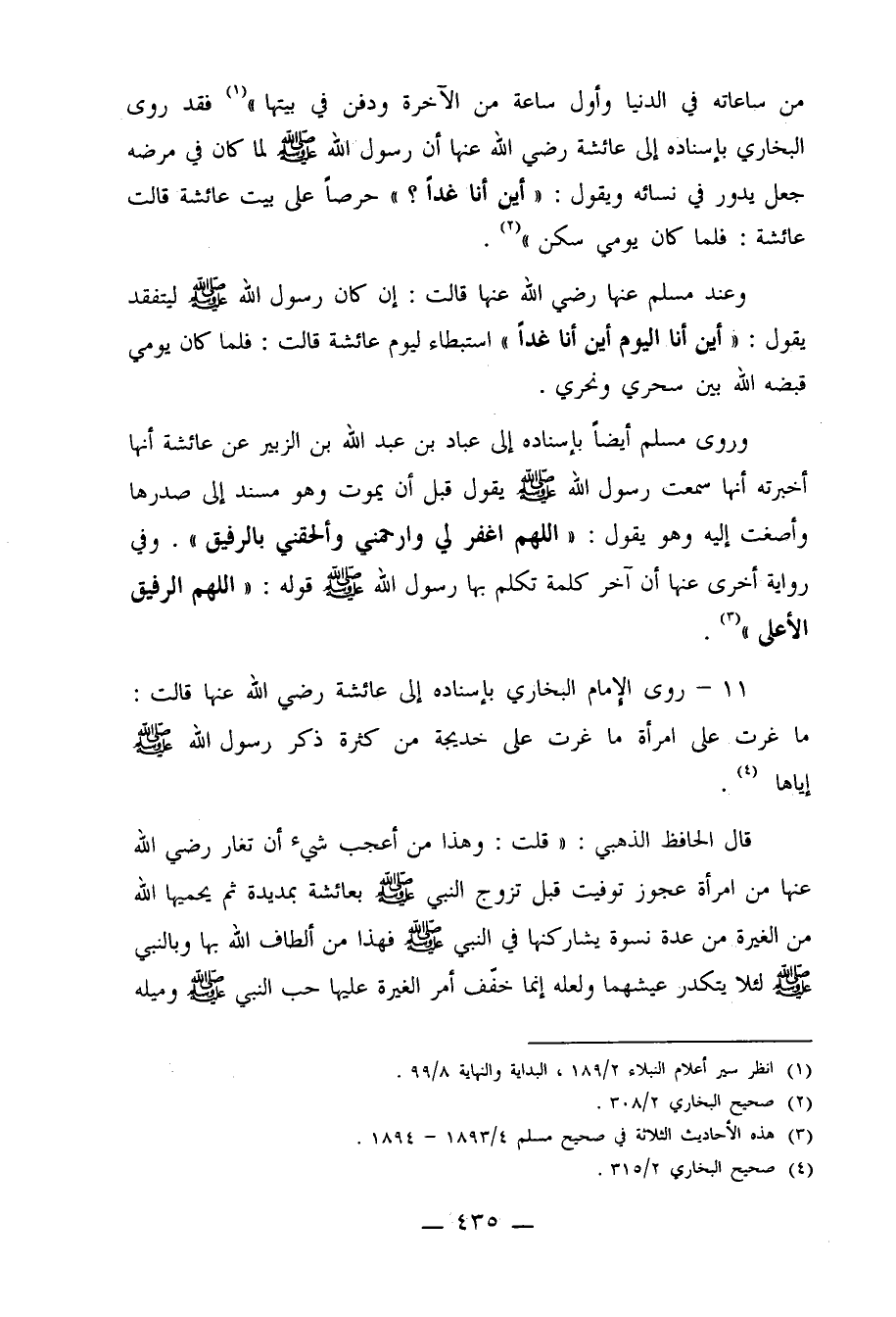 وروى مسلم أيضاً بإسناده إلى عباد بن عبد الله بن الزبير عن عائشة أنها أخبرته أنها سمعت رسول الله صلى الله عليه وسلم يقول قبل أن يموت وهو مسند إلى صدرها وأصغت إليه وهو يقول: "اللهم اغفر لي وارحمني وألحقني بالرفيق".