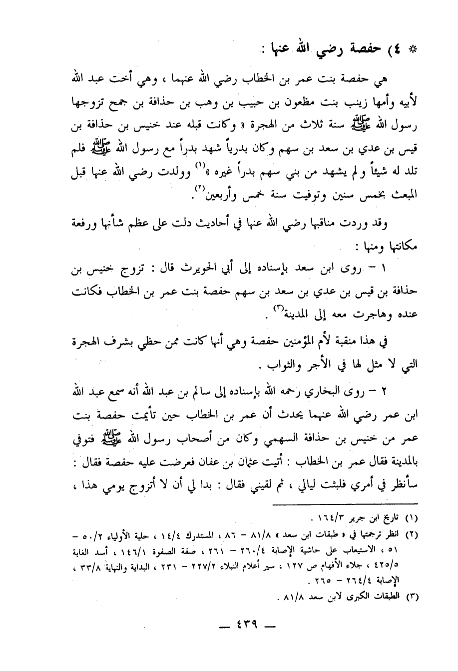 1- روى ابن سعد بإسناده إلى أبي الحويرث قال: تزوج خنيس بن حذافة بن قيس بن عدي بن سعد بن سهم حفصة بنت عمر بن الخطاب فكانت عنده وهاجرت معه إلى المدينة3.