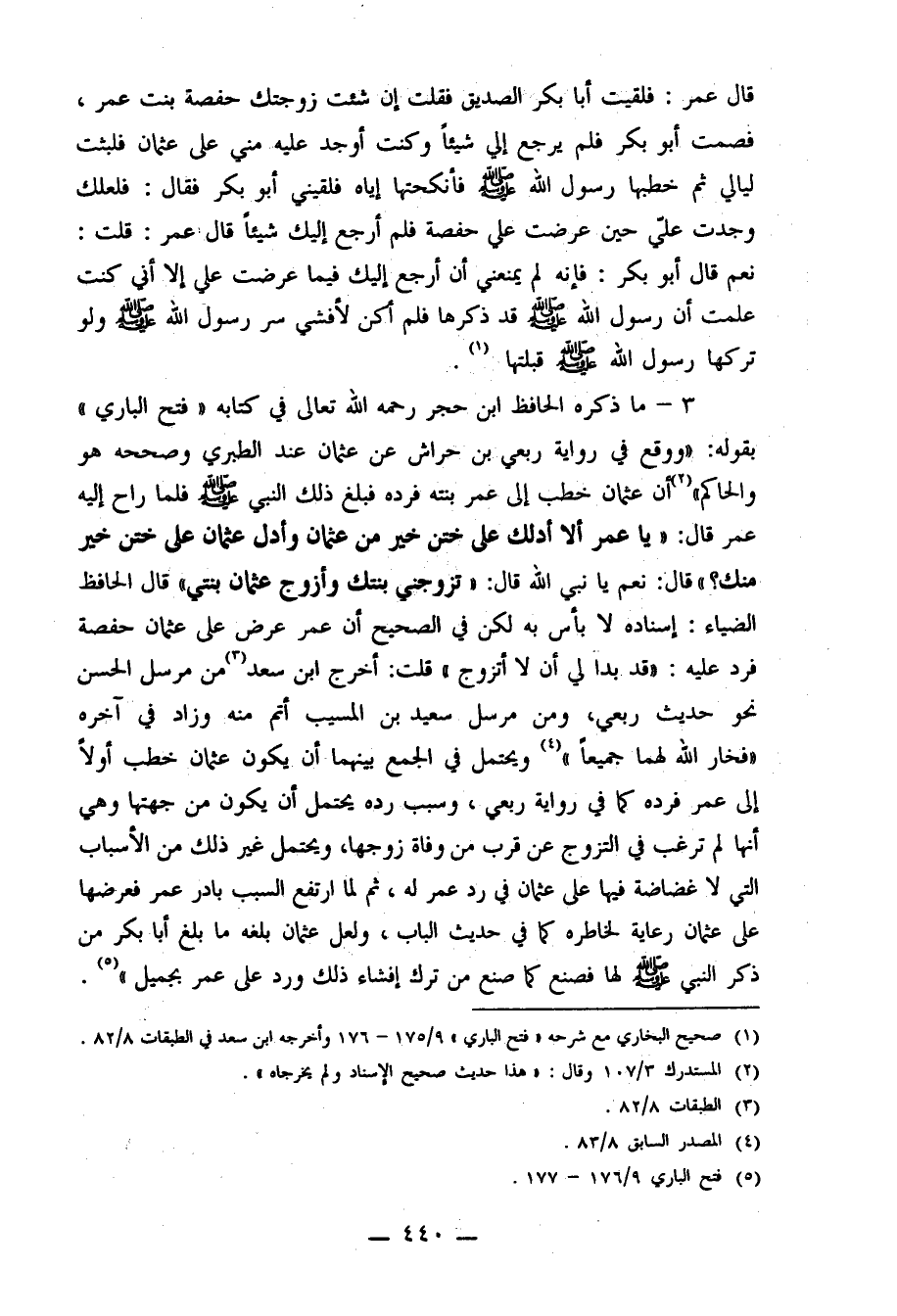 3- ما ذكره الحافظ ابن حجر رحمه الله تعالى في كتابه "فتح الباري" بقوله: "ووقع في رواية ربعي بن حراش عن عثمان عند الطبري وصححه هو والحاكم2 أن عثمان خطب إلى عمر بنته فرده فبلغ ذلك النبي صلى الله عليه وسلم فلما راح إليه عمر قال: "يا عمر ألا أدلك على ختن خير من عثمان وأدل عثمان على ختن خير منك؟ " قال: نعم يا نبي الله قال: "تزوجني بنتك وأزوج عثمان بنتي" قال الحافظ الضياء: إسناده لا بأس به لكن في الصحيح أن عمر عرض على عثمان حفصة فرد عليه: "قد بدا لي أن لا أتزوج" قلت: أخرج ابن سعد3 من مرسل الحسن نحو حديث ربعي، ومن مرسل سعيد بن المسيب أتم منه وزاد في آخره "فخار الله لهما جميعاً"4. ويحتمل في الجمع بينهما أن يكون عثمان خطب أولاً إلى عمر فرده كما في رواية ربعي، وسبب رده يحتمل أن يكون من جهتها وهي أنها لم ترغب في التزوج عن قرب من وفاة زوجها ويحتمل غير ذلك من الأسباب التي لا غضاضة فيها على عثمان في رد عمر له، ثم لما ارتفع السبب بادر عمر فعرضها على عثمان رعاية لخاطره كما في حديث الباب، ولعل عثمان بلغه ما بلغ أبا بكر من ذكر النبي صلى الله عليه وسلم لها فصنع كما صنع من ترك إفشاء ذلك ورد على عمر بجميل"5.