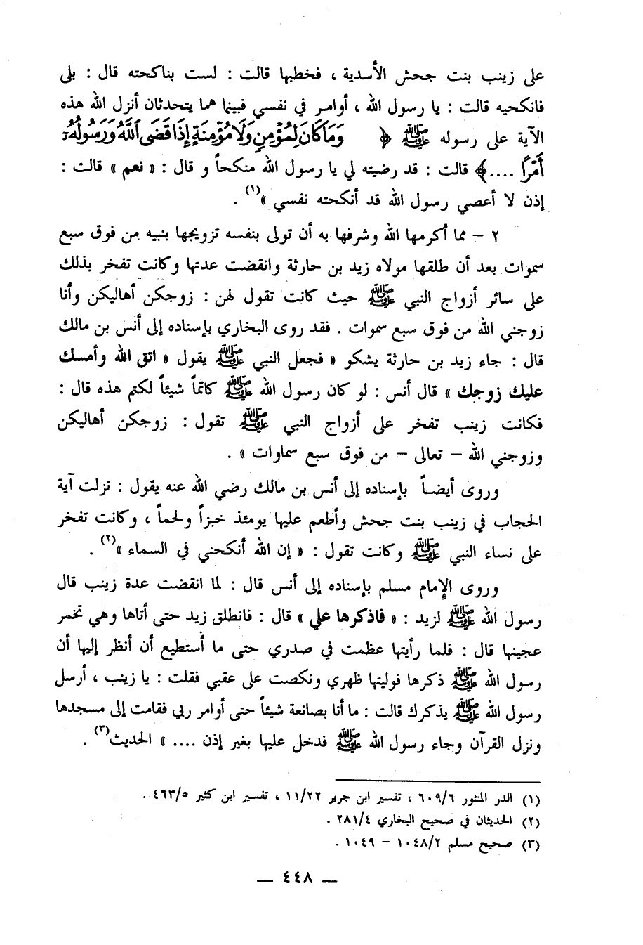 وروى الإمام مسلم بإسناده إلى أنس قال: لما انقضت عدة زينب قال رسول الله صلى الله عليه وسلم لزيد: "فاذكرها علي" قال: فانطلق زيد حتى أتاها وهي تخمر عجينها قال: فلما رأيتها عظمت في صدري حتى ما أستطيع أن أنظر إليها أن رسول الله صلى الله عليه وسلم ذكرها فوليتها ظهري ونكصت على عقبي فقلت: يا زينب، أرسل رسول الله صلى الله عليه وسلم يذكرك قالت: ما أنا بصانعة شيئاً حتى أوامر ربي فقامت إلى مسجدها ونزل القرآن وجاء رسول الله صلى الله عليه وسلم فدخل عليها بغير إذن ... "الحديث3.