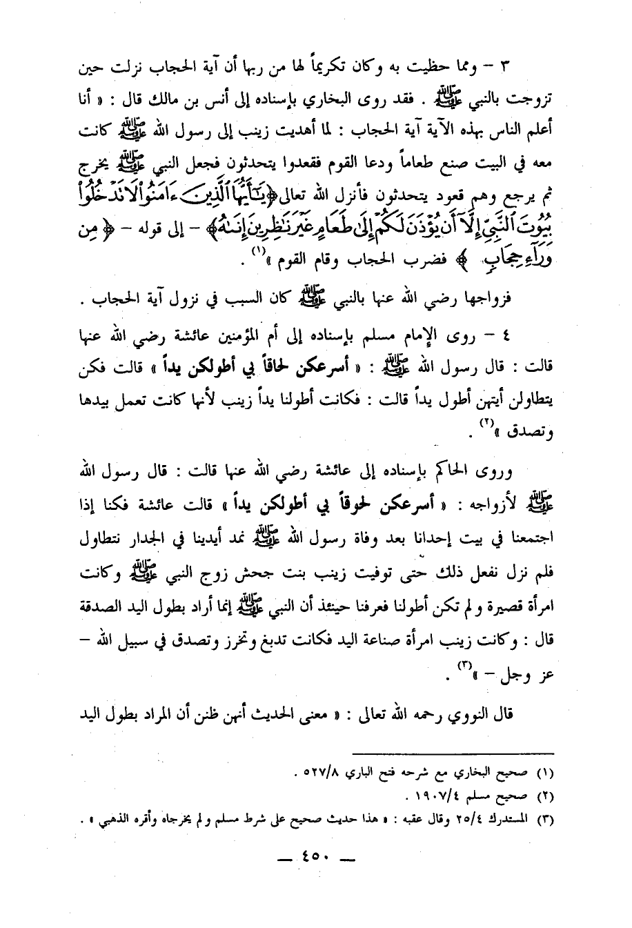 4- روى الإمام مسلم بإسناده إلى أم المؤمنين عائشة رضي الله عنها قالت: قال رسول الله صلى الله عليه وسلم: "أسرعكن لحاقاً بي أطولكن يداً" قالت: فكن يتطاولن أيتهن أطول يداً قالت: فكانت أطولنا يداً زينب لأنها كانت تعمل بيدها وتصدق"2.