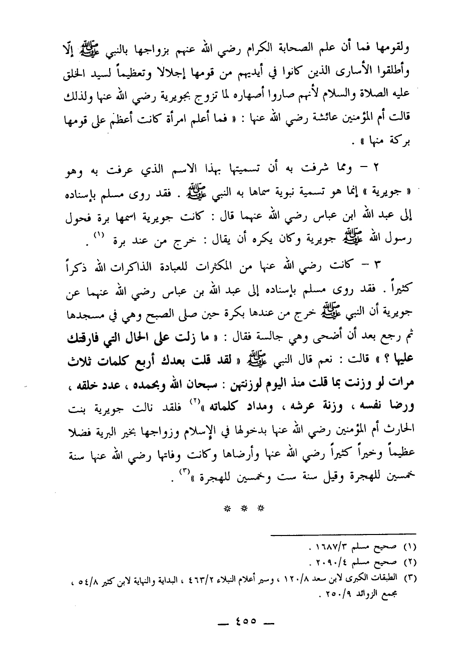 2- ومما شرفت به أن تسميتها بهذا الاسم الذي عرفت به وهو جويرية إنما هو تسمية نبوية سماها به النبي صلى الله عليه وسلم. فقد روى مسلم بإسناده إلى عبد الله ابن عباس رضي الله عنهما قال: كانت جويرية اسمها برة فحول رسول الله صلى الله عليه وسلم جويرية وكان يكره أن يقال: خرج من عند برة1.