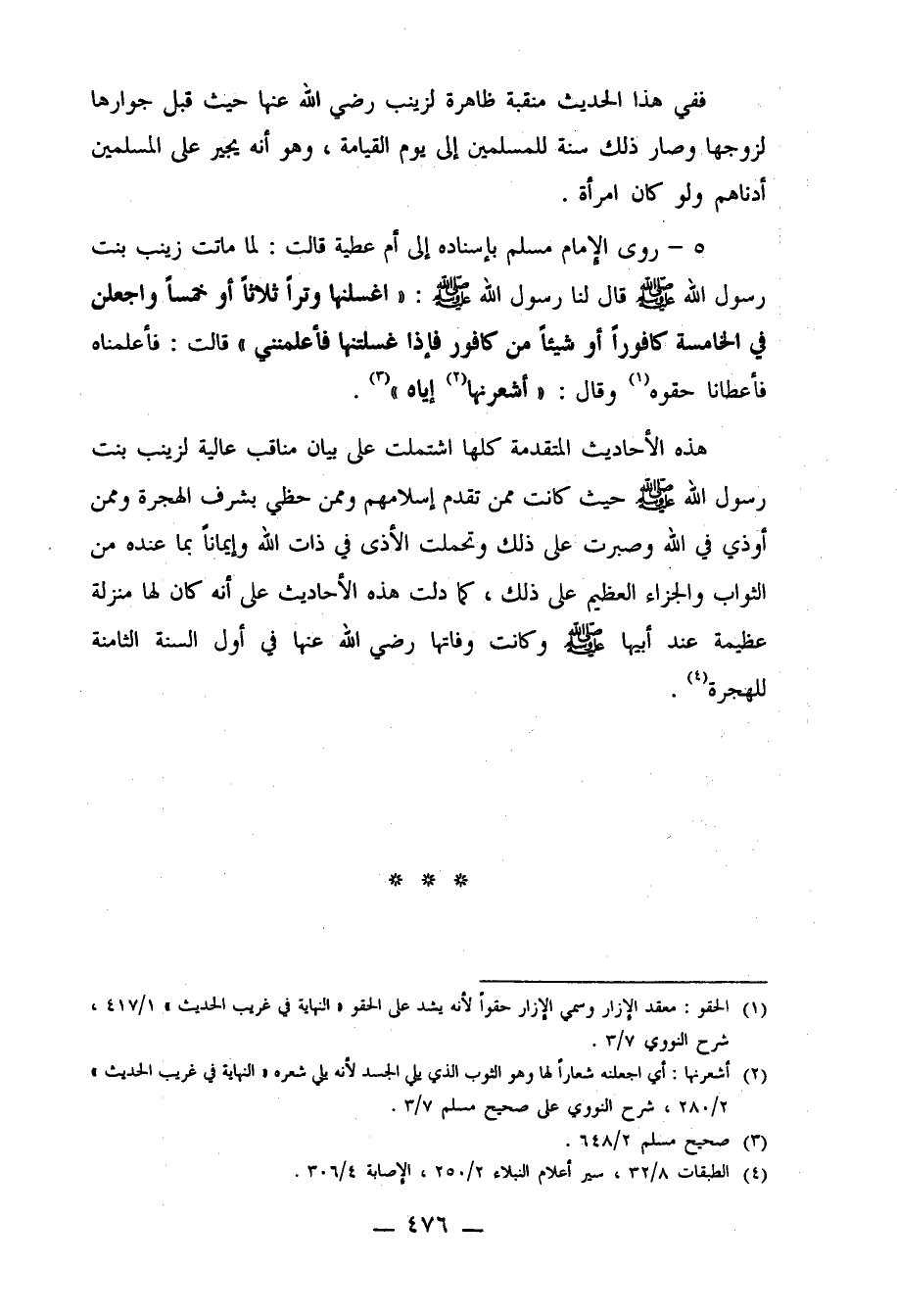 5- روى الإمام مسلم بإسناده إلى أم عطية قالت: لما ماتت زينب بنت رسول الله صلى الله عليه وسلم قال لنا رسول الله صلى الله عليه وسلم: "اغسلنها وتراً ثلاثاً أو خمساً واجعلن في الخامسة كافوراً أو شيئا من كافور فإذا غسلتنها فأعلمنني" قالت: فأعلمناه فأعطانا حقوه1 وقال: "أشعرنها 2 إياه" 3.
