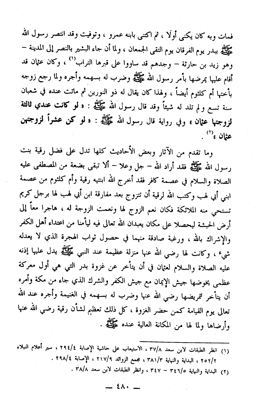 فمات وبه كان يكنى أولاً، ثم اكتنى بابنه عمرو، وتوفيت وقد انتصر رسول الله صلى الله عليه وسلم ببدر يوم الفرقان يوم التقى الجمعان ولما أن جاء البشير بالنصر إلى المدينة ـ وهو زيد بن حارثة ـ وجدهم قد ساووا على قبرها التراب1، وكان عثمان قد أقام عليها يمرضها بأمر رسول الله صلى الله عليه وسلم وضرب له بسهمه وأجره ولما رجع زوجه بأختها أم كلثوم أيضاً، ولهذا كان يقال له: ذو النورين ثم ماتت عنده في شعبان سنة تسع ولم تلد له شيئاً وقد قال رسول الله صلى الله عليه وسلم: "لو كانت عندي ثالثة لزوجتها عثمان" وفي رواية قال رسول الله صلى الله عليه وسلم: "لو كن عشراً لزوجتهن عثمان" 2.