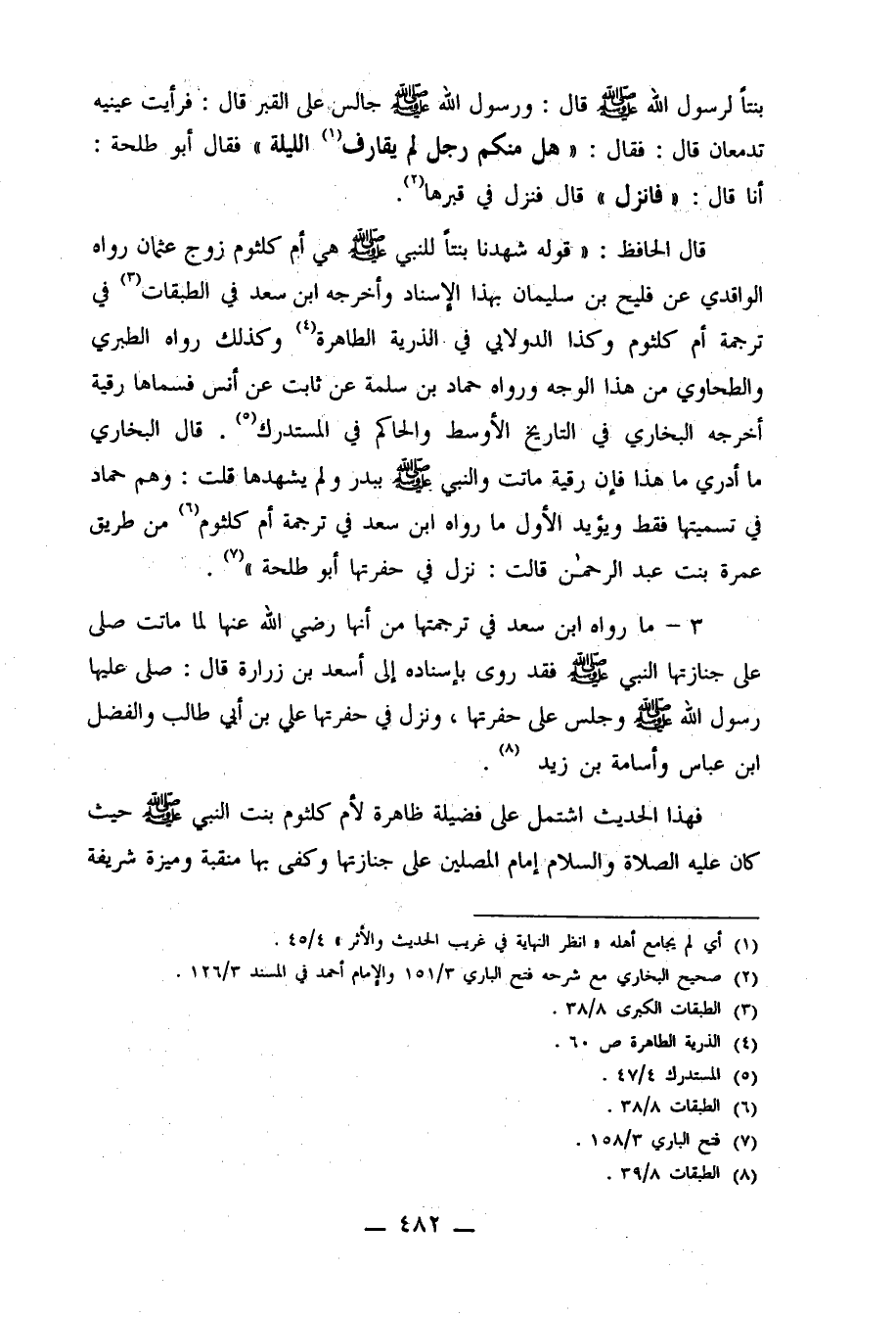 3- ما رواه ابن سعد في ترجمتها من أنها رضي الله عنها لما مات صلى على جنازتها النبي صلى الله عليه وسلم فقد روى بإسناده إلى أسعد بن زرارة قال: صلى عليها رسول الله صلى الله عليه وسلم وجلس على حفرتها، ونزل في حفرتها علي بن أبي طالب والفضل بن عباش وأسامة بن زيد8.