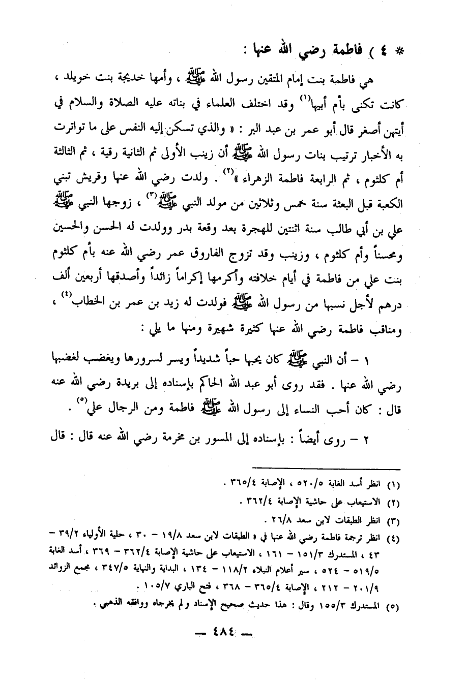 4ـ انظر ترجمة فاطمة رضي الله عنها في: " الطبقات لابن سعد 8/19-30، حلية الأولياء 2/39-43، المستدرك 3/151-161، الاستيعاب على حاشية الإصابة 4/362-369، أسد الغابة 5/519-524، سير أعلام النبلاء 2/118-134، البداية والنهاية 5/347، مجمع الزوائد 9/201-212، الإصابة 4/365-368، فتح الباري 3/105.