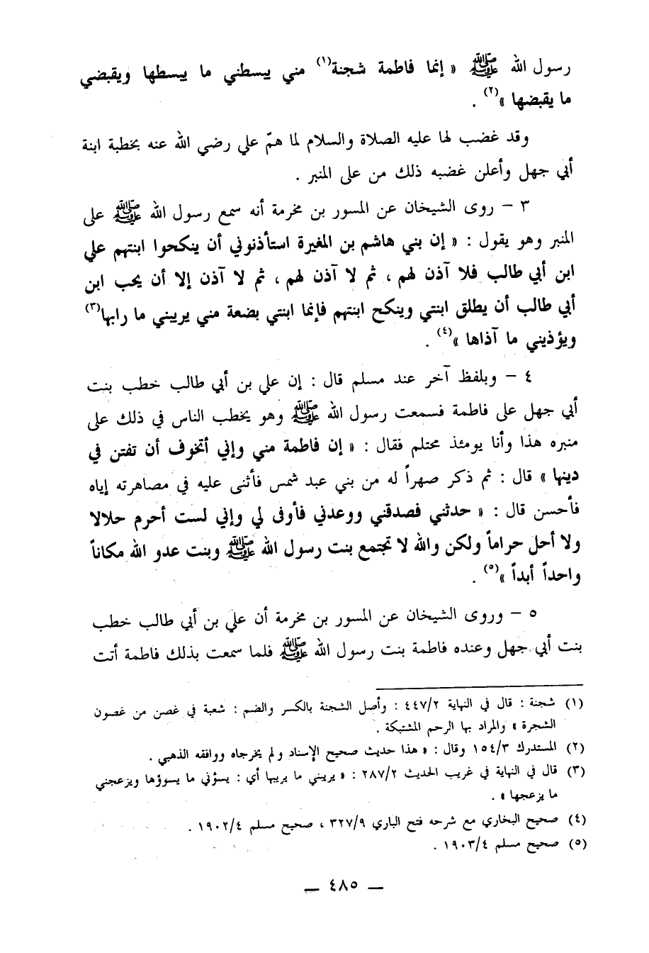 5- وروى الشيخان عن المسور بن مخرمة أن علي بن أبي طالب خطب بنت أبي جهل وعنده فاطمة بنت رسول الله صلى الله عليه وسلم فلما سمعت بذلك فاطمة أتت