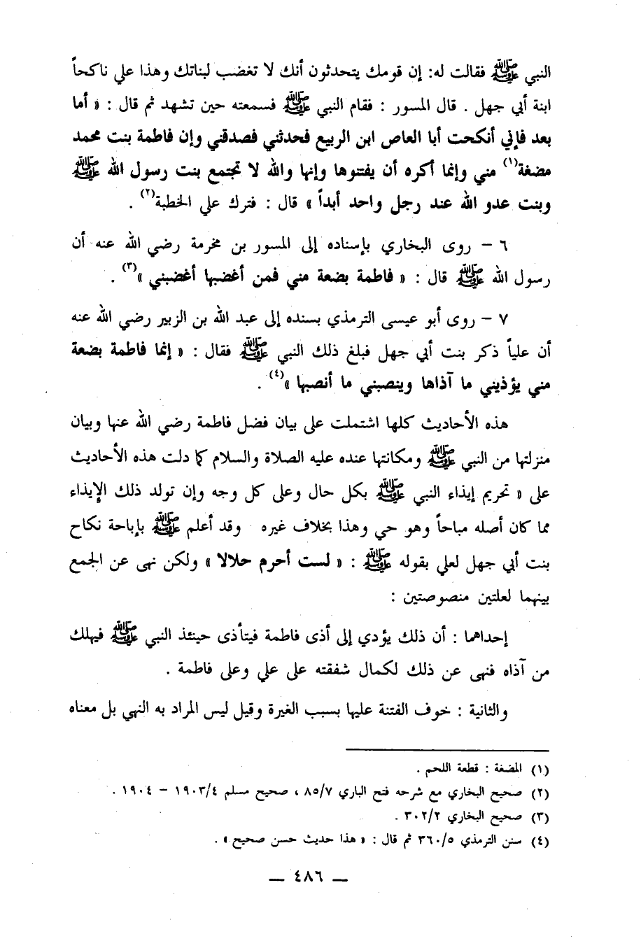 6- روى البخاري بإسناده إلى المسور بن مخرمة رضي الله عنه أن رسول الله صلى الله عليه وسلم قال: "فاطمة بضعة مني فمن أغضبها أغضبني" 3.