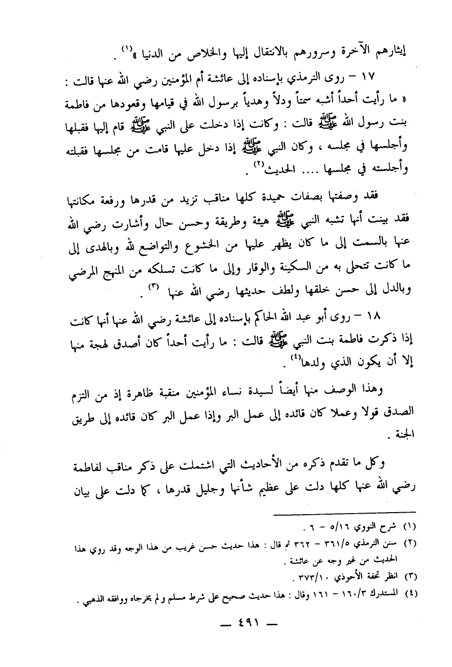 17- روى الترمذي بإسناده إلى عائشة أم المؤمنين رضي الله عنها قالت: "ما رأيت أحداً أشبه سمتاً ودلاً وهدياً برسول الله في قيامها وقعودها من فاطمة بنت رسول الله صلى الله عليه وسلم قالت: وكانت إذا دخلت على النبي صلى الله عليه وسلم قام إليها فقبلها وأجلسها في مجلسه، وكان النبي صلى الله عليه وسلم إذا دخل عليها قامت من مجلسها فقبلته وأجلسته في مجلسها..الحديث2.