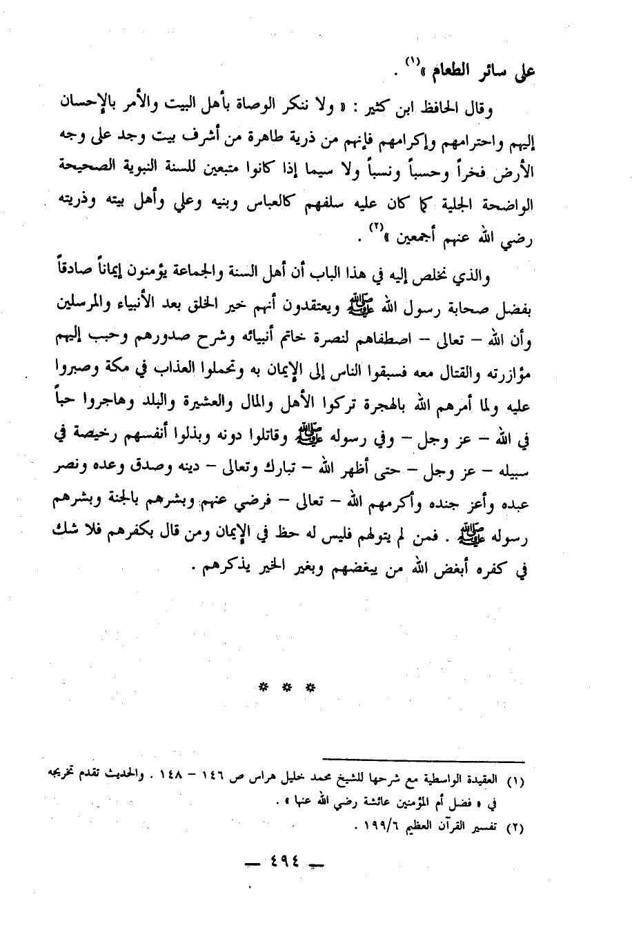 وقال الحافظ ابن كثير: "ولا ننكر الوصاة بأهل البيت والأمر بالإحسان إليهم واحترامهم وإكرامهم فإنهم من ذرية طاهرة من أشرف بيت وجد على وجه الأرض فخراً وحسباً ونسباً ولا سيما إذا كانوا متبعين للسنة النبوية الصحيحة الواضحة الجلية كما كان عليه سلفهم كالعباس وبنيه وعلي وأهل بيته وذريته رضي الله عنهم أجمعين"2.