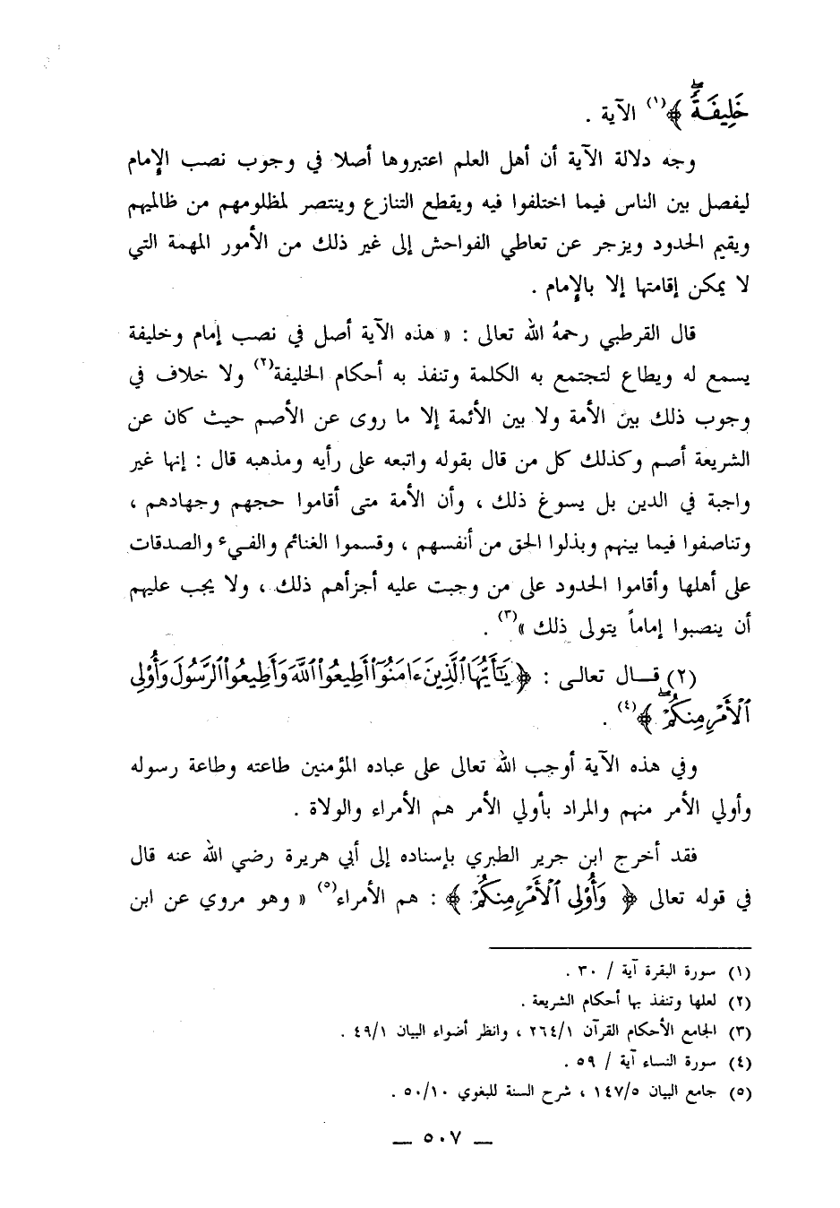 قال القرطبي رحمه الله تعالى: "هذه الآية أصل في نصب إمام وخليفة يسمع له ويطاع لتجتمع به الكلمة وتنفذ به أحكام الخليفة2 ولا خلاف في وجوب ذلك بين الأمة ولا بين الأئمة إلا ما روي عن الأصم حيث كان عن الشريعة أصم وكذلك كل من قال بقوله واتبعه على رأيه ومذهبه قال: إنها غير واجبة في الدين بل يسوغ ذلك، وأن الأمة متى أقاموا حجهم وجهادهم، وتناصفوا فيما بينهم وبذلوا الحق من أنفسهم، وقسموا الغنائم والفيء والصدقات على أهلها وأقاموا الحدود على من وجبت عليه أجزأهم ذلك، ولا يجب عليهم أن ينصبوا إماماً يتولى ذلك"3.
