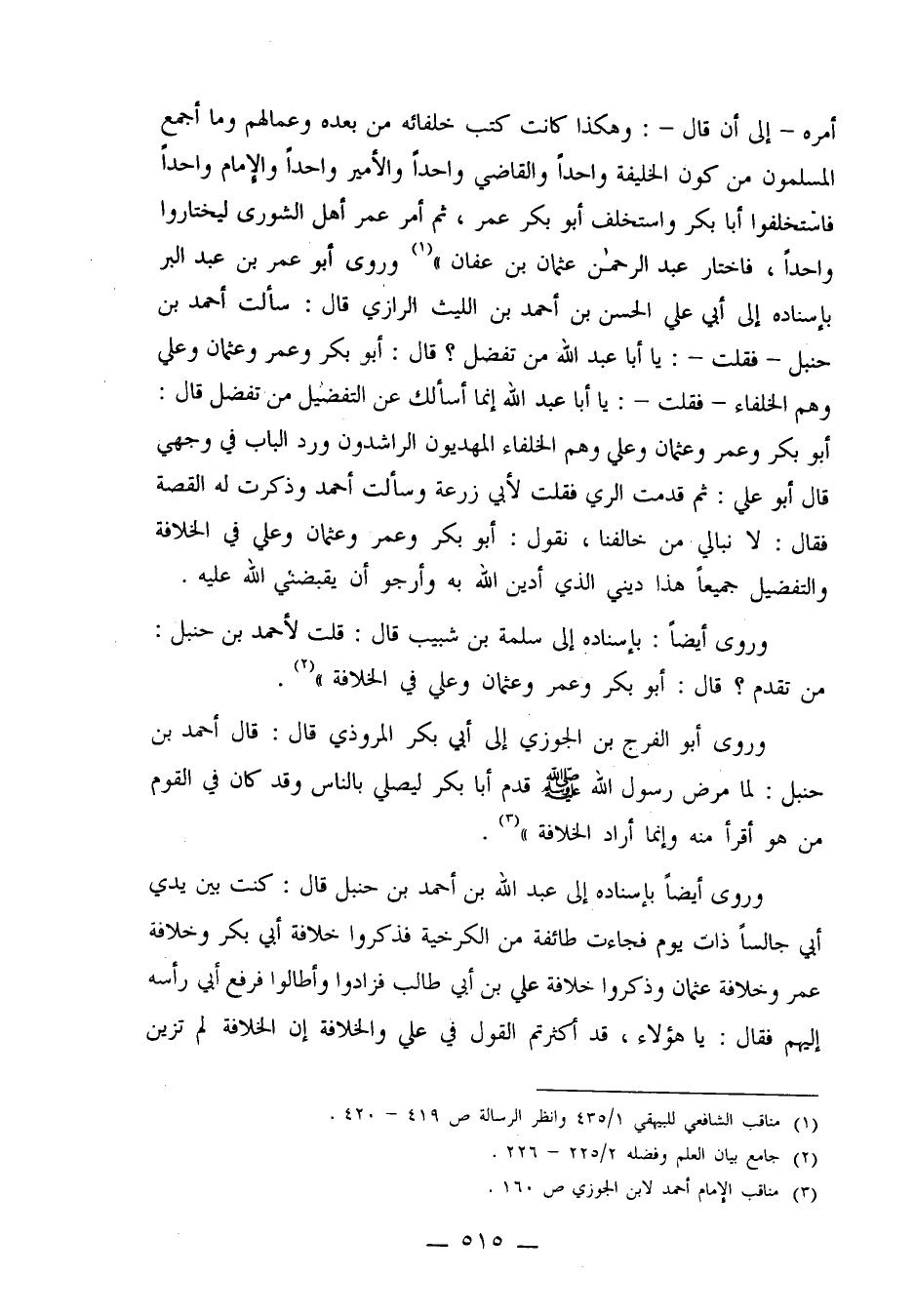 أمره ـ إلى أن قال ـ: وهكذا كانت كتب خلفائة من بعده وعمالهم وما أجمع المسلمون من كون الخليفة واحداً والقاضي واحداً والأمير واحداً والإمام واحداً فاستخلفوا أبا بكر واستخلف أبو بكر عمر، ثم أمر عمر أهل الشورى ليختاروا واحداً، فاختار عبد الرحمن عثمان بن عفان"1 وروى أبو عمر بن عبد البر بإسناده إلى أبي علي الحسن بن أحمد بن الليث الرازي قال: سألت أحمد بن حنبل ـ فقلت ـ: يا أبا عبد الله من تفضل؟ قال: أبو بكر وعمر وعثمان وعلي وهم الخلفاء ـ فقلت ـ يا أبا عبد الله إنما أسألك عن التفضيل من تفضل قال: أبو بكر وعمر وعثمان وعلي وهم الخلفاء المهديون الراشدون ورد الباب في وجهي قال أبو علي: ثم قدمت الري فقلت لأبي زرعة وسألت أحمد وذكرت له القصة فقال: لا نبالي من خالفنا، نقول: أبو بكر وعمر وعثمان وعلي في الخلافة والتفضيل جميعاً هذا ديني الذي أدين الله به وأرجو أن يقبضني الله عليه.