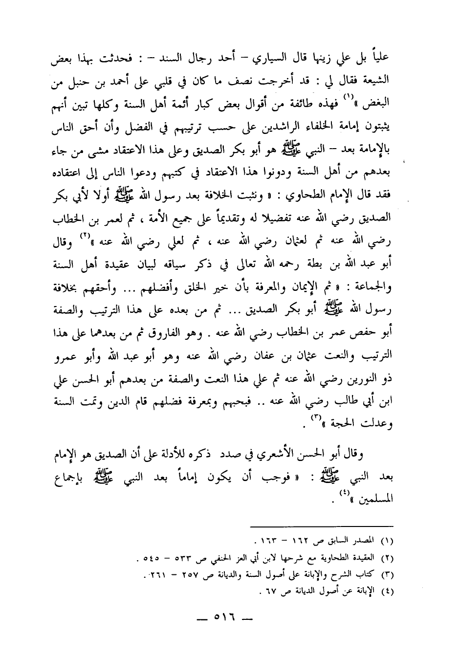 وقال أبو عبد الله بن بطة رحمه الله تعالى في ذكر سياقه لبيان عقيدة أهل السنة والجماعة: "ثم الإيمان والمعرفة بأن خير الخلق وأفضلهم ... وأحقهم بخلافة رسول الله صلى الله عليه وسلم أبو بكر الصديق ... ثم من بعده على هذا الترتيب والصفة أبو حفص عمر بن الخطاب رضي الله عنه وهو الفاروق ثم من بعدهما على هذا الترتيب والنعت عثمان بن عفان رضي الله عنه وهو أبو عبد الله وأبو عمرو ذو النورين رضي الله عنه ثم علي هذا النعت والصفة من بعدهم أبو الحسن علي ابن أبي طالب رضي الله عنه ... فبحبهم وبمعرفة فضلهم قام الدين وتمت السنة وعدلت الحجة"3.