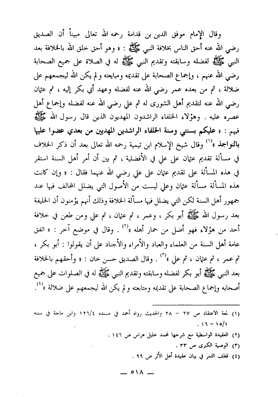 وقال الإمام موفق الدين بن قدامة رحمه الله تعالى مبيناً أن الصديق رضي الله عنه أحق الناس بخلافة النبي صلى الله عليه وسلم: "وهو أحق خلق الله بالخلافة بعد النبي صلى الله عليه وسلم لفضله وسابقته وتقديم النبي صلى الله عليه وسلم له في الصلاة على جميع الصحابة رضي الله عنهم، وإجماع الصحابة على تقديمه ومبايعته ولم يكن الله ليجمعهم على ضلالة ثم من بعده عمر رضي الله عنه لفضله وعهد أبي بكر إليه، ثم عثمان رضي الله عنه لتقديم أهل الشورى له، ثم علي رضي الله عنه لفضله وإجماع أهل عصره عليه. وهؤلاء الخلفاء الراشدون المهديون الذين قال رسول الله صلى الله عليه وسلم فيهم: "عليكم بسنتي وسنة الخلفاء الراشدين المهديين من بعدي عضوا عليها بالنوجذ" 1.