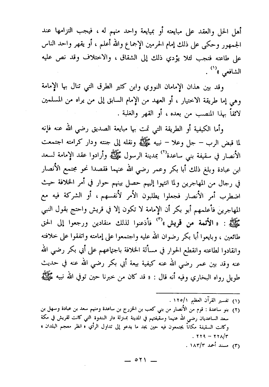 وقد بين هذان الإمامان النووي وابن كثير الطرق التي تنال بها الإمامة وهي إما طريقة الاختيار، أو العهد من الإمام السابق إلى من يراه من المسلمين لائقاً بهذا المنصب من بعده، أو القهر والغلبة.