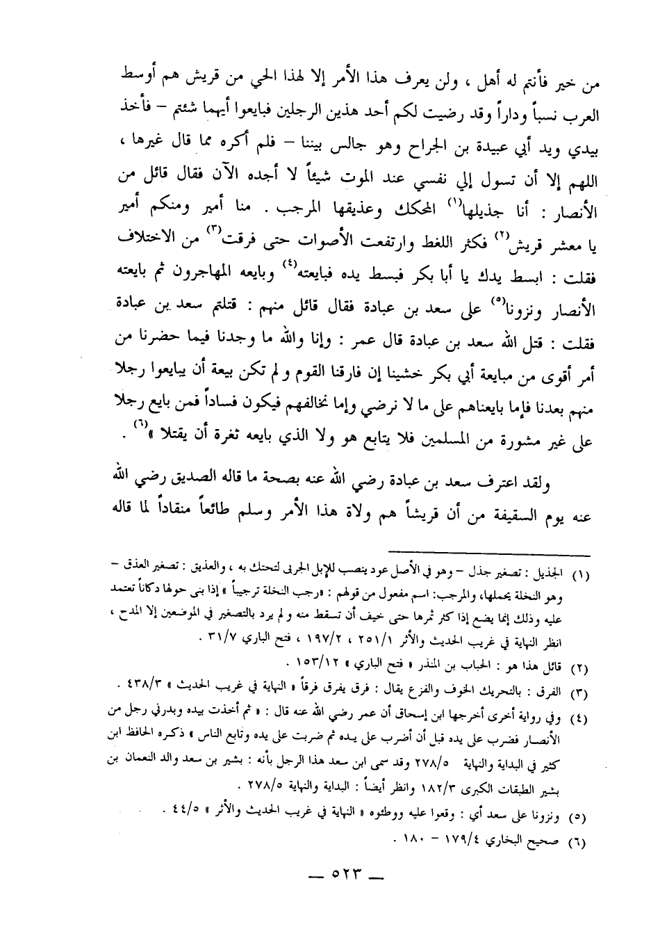 4ـ وفي رواية أخرى أخرجها ابن إسحاق أن عمر رضي الله عنه قال: "ثم أخذت بيده وبدرني رجل من الأنصار فضرب على يده قبل أن أضرب على يده ثم ضربت على يده وتابع الناس "ذكره الحافظ ابن كثير في البداية والنهاية 5/278، وقد سمى ابن سعد هذا الرجل بأنه: بشير بن سعد والد النعمان بن بشير الطبقات الكبرى 3/182 وانظر: البداية والنهاية 5/278.