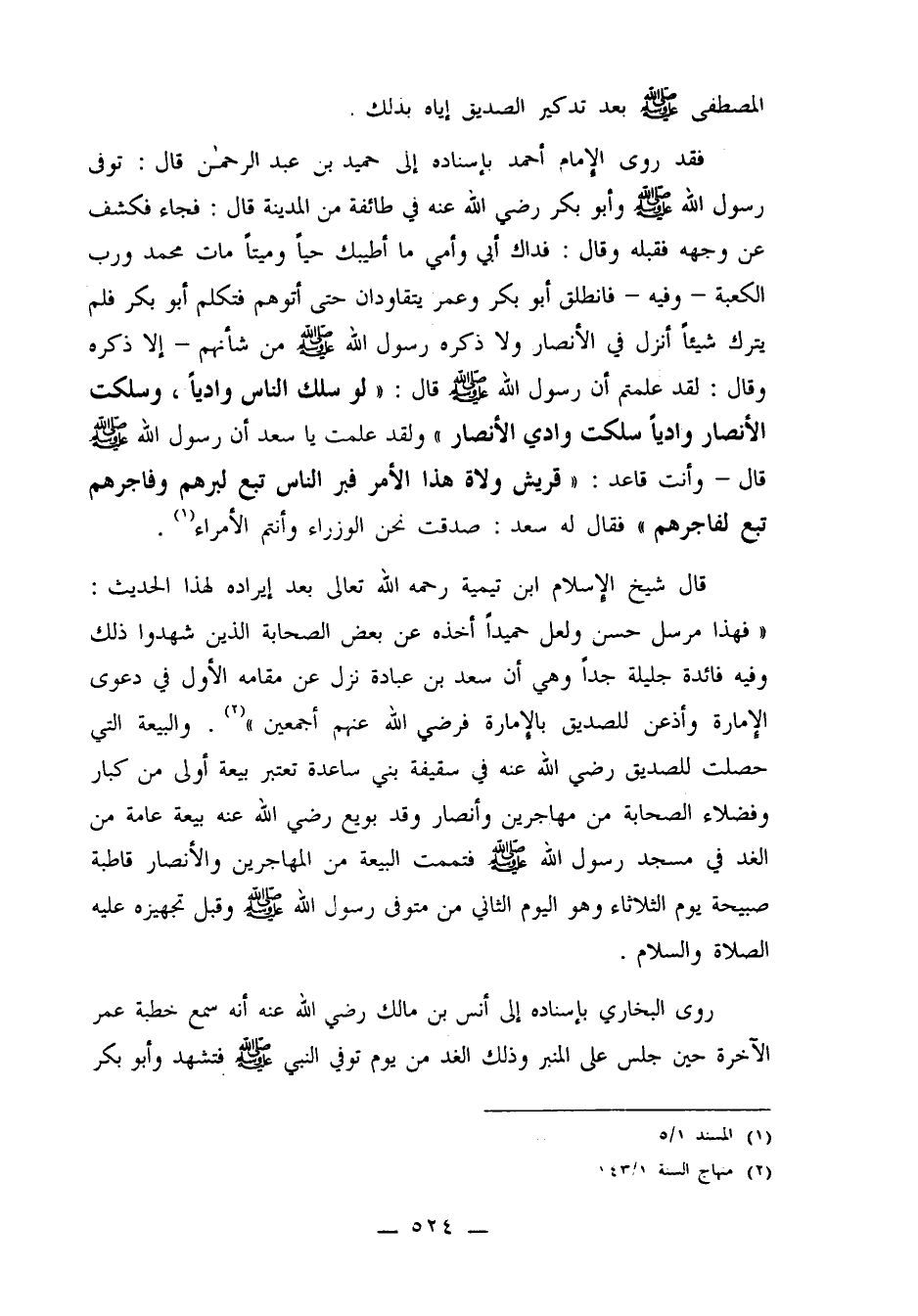 فقد روى الإمام أحمد بإسناده إلى حميد بن عبد الرحمن قال: توفي رسول الله صلى الله عليه وسلم وأبو بكر رضي الله عنه في طائفة من المدينة قال: فجاء فكشف عن وجهه فقبله وقال: فداك أبي وأمي ما أطيبك حياً وميتاً مات محمد ورب الكعبة ـ وفيه ـ فانطلق أبو بكر وعمر يتقاودان حتى أتوهم فتكلم أبو بكر فلم يترك شيئاً أنزل في الأنصار ولا ذكره رسول الله صلى الله عليه وسلم صلى الله عليه وسلم من شأنهم ـ إلا ذكره وقال: لقد علمتم أن رسول الله صلى الله عليه وسلم قال: "لو سلك وادياً وسلكت الأنصار وادياً سلكت وادي الأنصار" ولقد علمت يا سعد أن رسول الله صلى الله عليه وسلم قال ـ وأنت قاعد: "قريش ولاة هذا الأمر فبر الناس تبع لبرهم وفاجرهم تبع لفاجرهم" فقال له سعد: صدقت نحن الوزراء وأنتم الأمراء1.