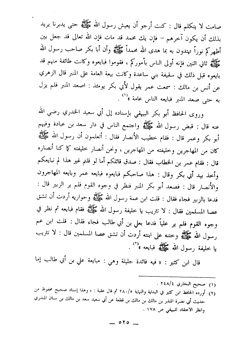 صامت لا يتكلم قال: كنت أرجو أن يعيش رسول الله صلى الله عليه وسلم حتى يدبرنا يريد بذلك أن يكون آخرهم ـ فإن يك محمد قد مات فإن الله تعالى قد جعل بين أظهركم نوراً تهتدون به بما هدى الله محمداً صلى الله عليه وسلم وأن أبا بكر صاحب رسول الله صلى الله عليه وسلم ثاني اثنين فإنه أولى الناس بأموركم، فقوموا بايعوه وكانت طائفة منهم قد بايعوه قبل ذلك في سقيفة بني ساعدة وكان بيعة العامة على المنبر قال الزهري عن أنس بن مالك: سمعت عمر يقول لأبي بكر يومئذ: اصعد المنبر فلم يزل حتى صعد المنبر فبايعه الناس عامة"1.
