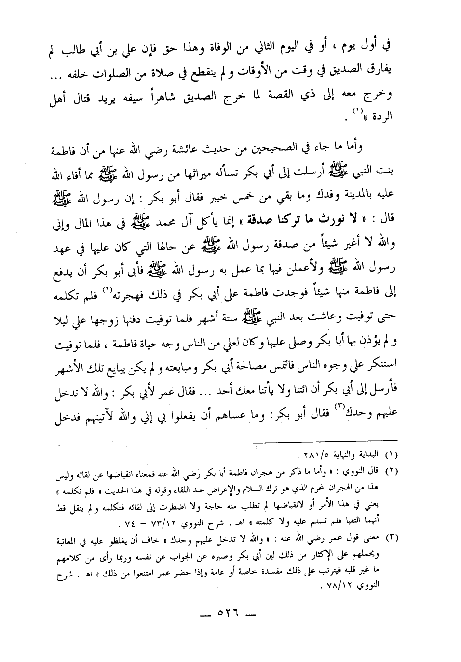 2ـ قال النووي: "وأما ما ذكر من هجران فاطمة أبا بكر رضي الله عنه فمعناه انقباضها عن لقائه وليس هذا من الهجران المحرم الذي هو ترك السلام والإعراض عند اللقاء وقوله في هذا الحديث "فلم تكلمه" يعني في هذا الأمر أو لانقباضها لم تطلب منه حاجة ولا اضطرت إلى لقائه فتكلمه ولم ينقل قط انهما التقيا فلم تسلم عليه ولا كلمته"أهـ. شرح النووي 12/73-74.