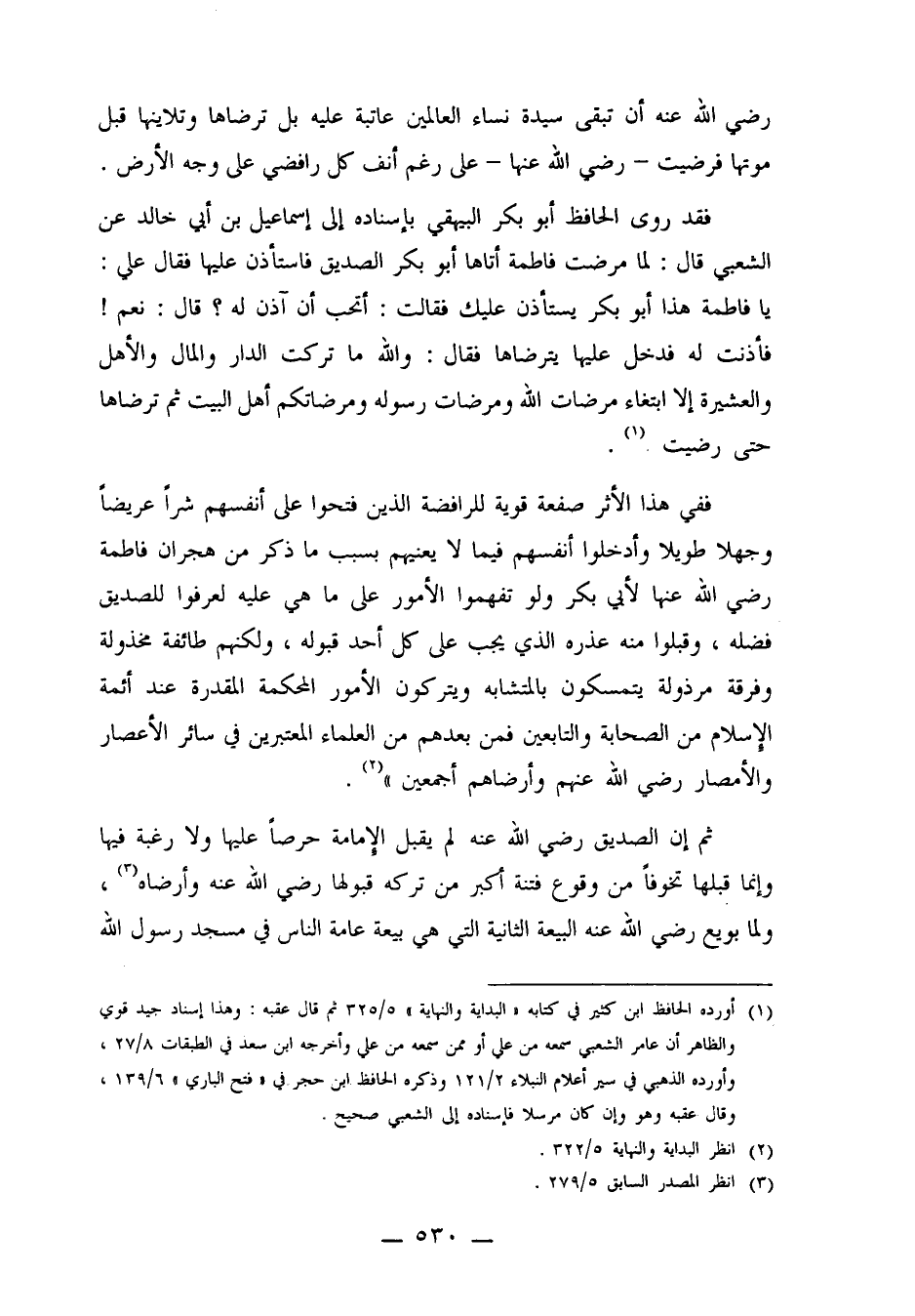 رضي الله عنه أن تبقى سيدة نساء العالمين عاتبه عليه بل ترضاها وتلاينها قبل موتها فرضيت ـ رضي الله عنها ـ على رغم أنف كل رافضي على وجه الأرض فقد روى الحافظ أبو بكر بإسناده إلى إسماعيل بن أبي خالد عن الشعبي قال: لما مرضت فاطمة أتاها أبو بكر الصديق فاستأذن عليها فقال علي: يا فاطمة هذا أبو بكر يستأذن عليك فقالت: أتحب أن آذن له؟ قال: نعم! فأذنت له فدخل عليها يترضاها فقال: والله ما تركت الدار والمال والأهل والعشيرة إلا ابتغاء مرضات الله ومرضات رسول الله صلى الله عليه وسلم ومرضاتكم أهل البيت ثم ترضاها حتى رضيت1.
