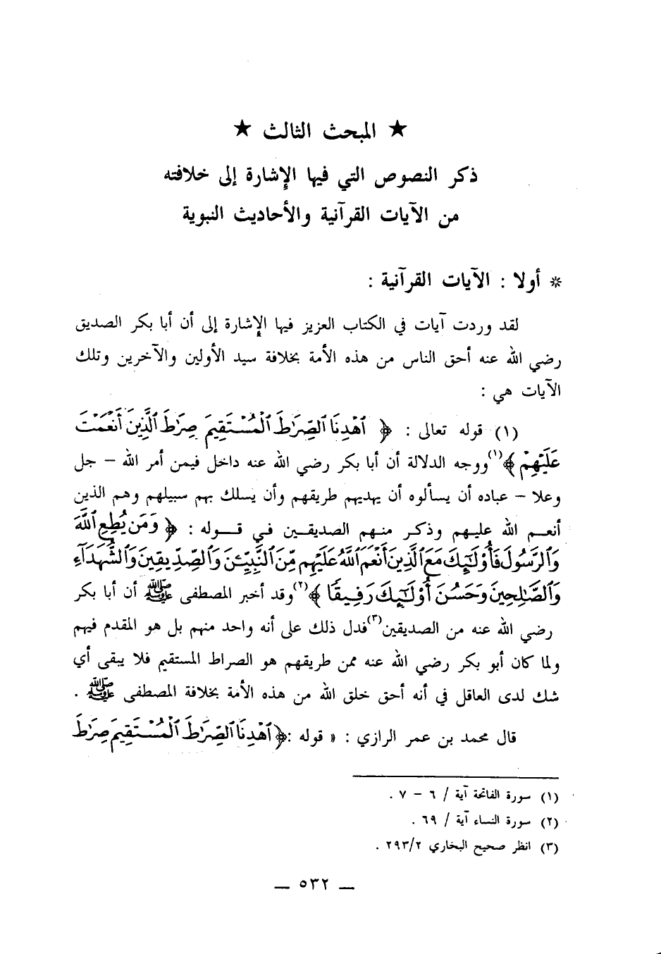 1/ قوله تعالى: {اهْدِنَا الصِّرَاطَ الْمُسْتَقِيمَ * صِرَاطَ الَّذِينَ أَنْعَمْتَ عَلَيْهِمْ} 1 ووجه الدلالة أن أبا بكر رضي الله عنه داخل فيمن أمر الله ـ جل وعلا ـ عباده أن يسألوه أن يهديهم طريقهم وأن يسلك بهم سبيلهم وهم الذين أنعم الله عليهم وذكر منهم الصديقين في قوله: {وَمَنْ يُطِعِ اللَّهَ وَالرَّسُولَ فَأُولَئِكَ مَعَ الَّذِينَ أَنْعَمَ اللَّهُ عَلَيْهِمْ مِنَ النَّبِيِّينَ وَالصِّدِّيقِينَ وَالشُّهَدَاءِ وَالصَّالِحِينَ وَحَسُنَ أُولَئِكَ رَفِيقاً} 2 وقد أخبر المصطفى صلى الله عليه وسلم أن أبا بكر رضي الله عنه من الصديقين3 فدل ذلك على أنه واحد منهم بل هو المقدم فيهم ولما كان أبو بكر رضي الله عنه ممن طريقهم هو الصراط المستقيم فلا يبقى أي شك لدى العاقل في أنه أحق خلق الله من هذه الأمة بخلافة المصطفى صلى الله عليه وسلم.